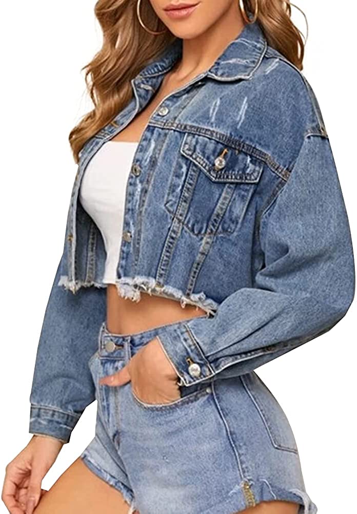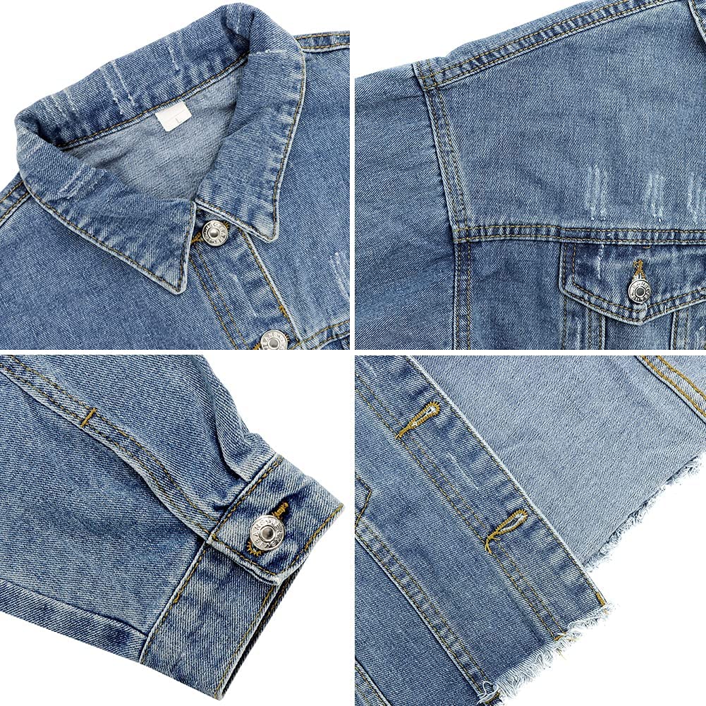 LONGYIDA Women's Jean Jacket Button Down Cropped Frayed Denim Jacket Coat