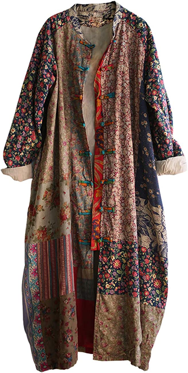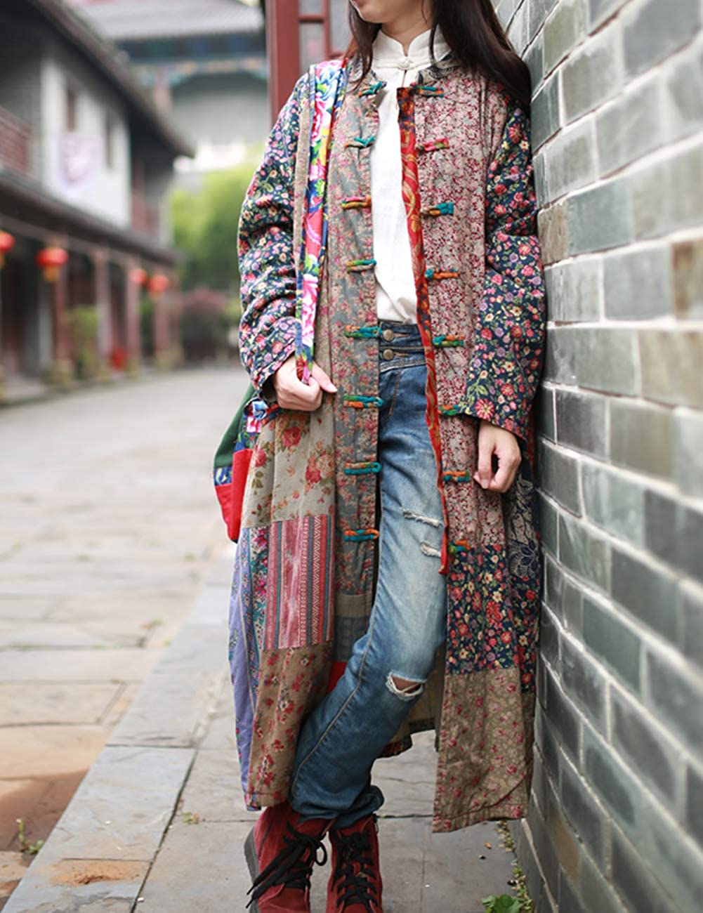 LZJN Women's Trench Coat Floral Print Jacket Chinese Style Patchwork Outwear