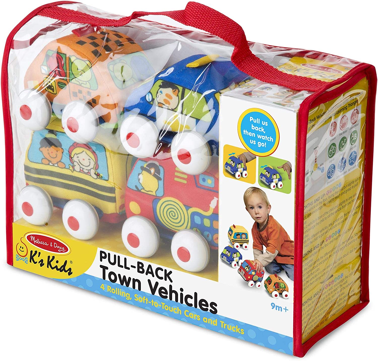 Wheel them back to get new skills speeding ahead! The "rev up" mechanism inside each of these four cars and trucks makes it easy for babies and toddlers to get big acceleration with just a little input: Pull back one of the soft vehicles--then release to see it zoom off across the floor! The action of grasping and pulling back is great for fine motor skills and hand-eye coordination; the activity of "driving" and collecting (pull, release, crawl) benefits large muscle groups and coordination, too. Get even more "miles per gallon" with a variety of colors, shapes and sizes, illustrated characters, and everyday themes to inspire conversations, cognitive connections, and imaginative play! These soft fabric vehicles are bound to be popular at playtime, but with four exciting vehicles there are enough to share. And parents and caregivers will be grateful for the removable wipe-clean wheelie insert and washable fabric surface! Melissa & Doug K's Kids toys nurture early childhood development in three key skill areas: physical, cognitive, and social. With interactive designs and multisensory features, K's Kids promotes constructive play and effortless learning, keeping interest high and new skills flourishing throughout the baby and toddler years! The Melissa & Doug Pull-Back Vehicles make a great gift for kids ages 9 months and up. Our toy cars are fun to play with and provide an exceptional screen-free play option for babies and toddlers. Please note it’s not recommended to leave children unattended in a crib with toys. For more than 30 years, Melissa & Doug has created beautifully designed imagination- and creativity-sparking products that NBC News called “the gold standard in early childhood play.” Today, Melissa & Doug is proudly partnering with the American Academy of Pediatrics to foster early brain development and help children build important life skills through play.