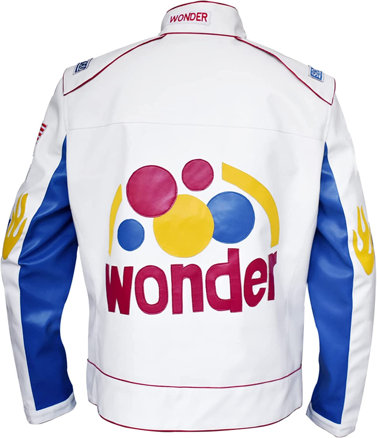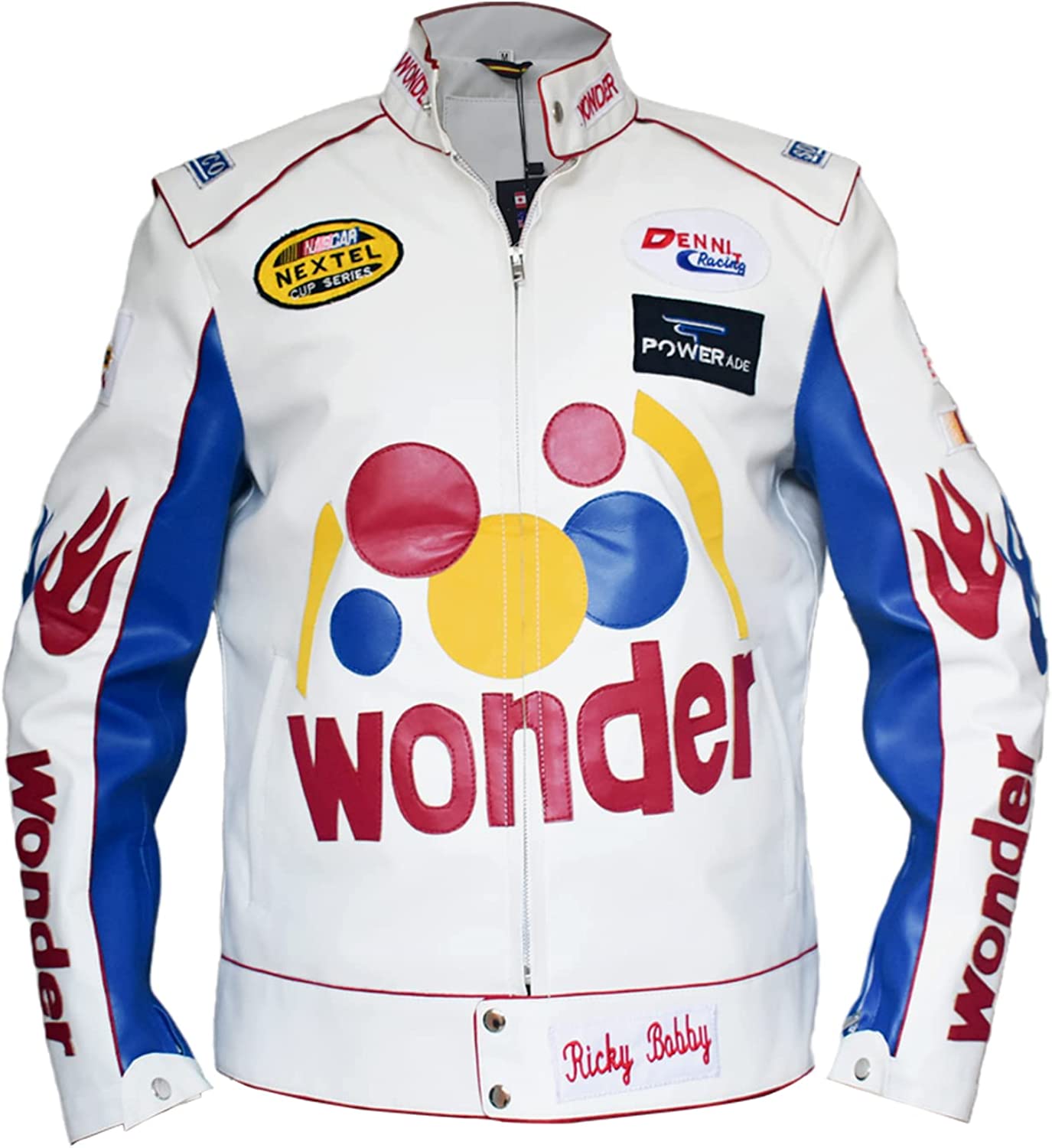 Mens Ricky Bobby Racing White Faux Leather Motorcycle Wonder Jacket, XXS-5XL