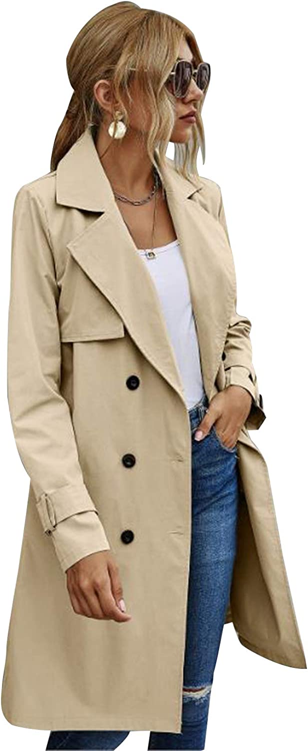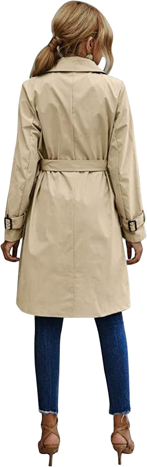 MIEAHORY Women Solid Color Jacket, Adults Long Sleeve Lapel Double Breasted Belted Trench Coat