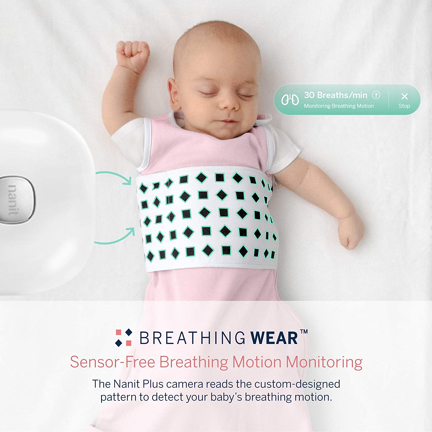 Breathing wear works exclusively with the Nanit Plus camera to monitor your baby's breathing motion without putting sensors on your baby. Contains one sleeping bag suitable for babies 6-12 months old or 16-22 lbs.