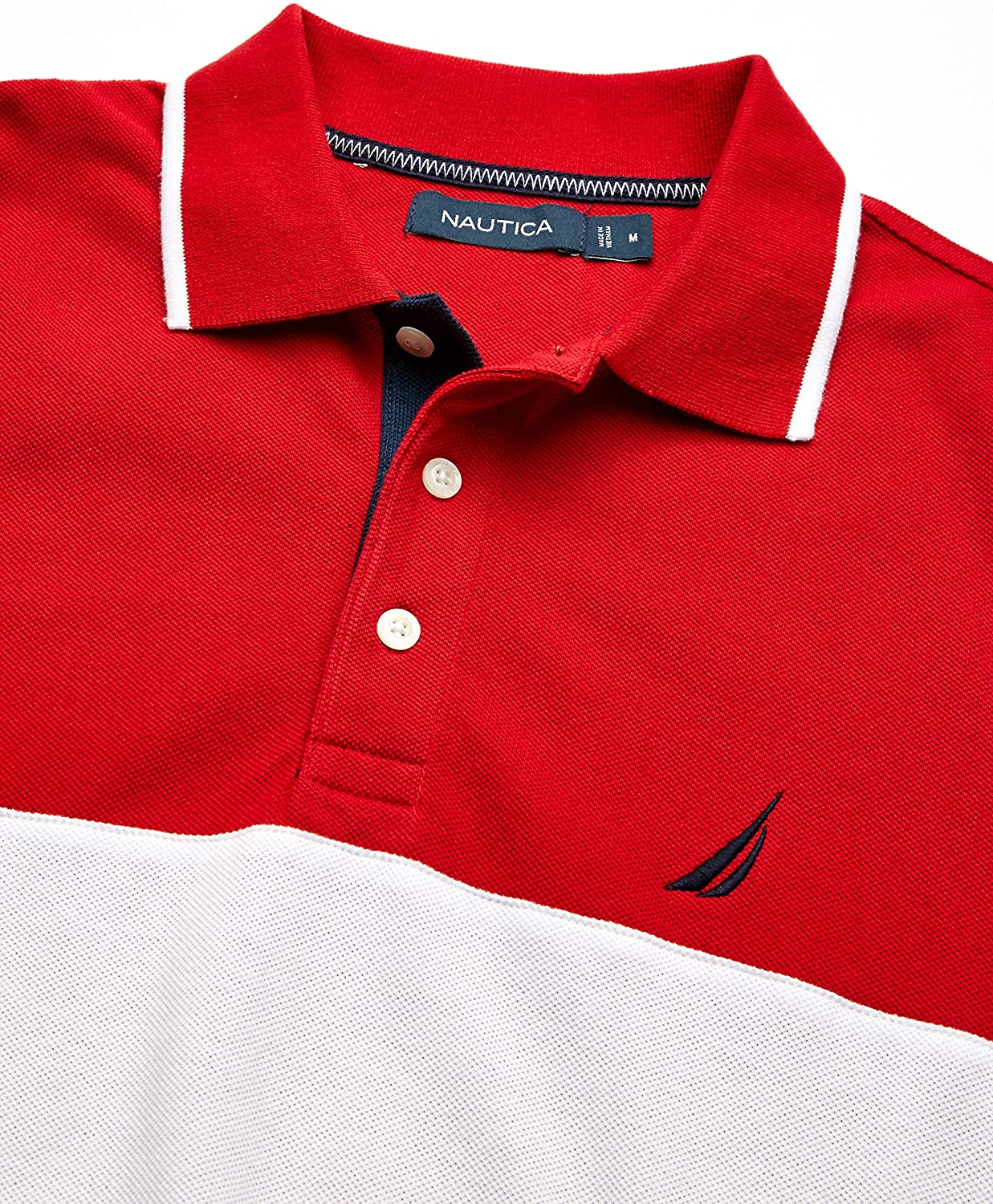 With a bold, color-blocked design and a comfortable fit, this polo shirt keeps it classic with an athletic collar and placket, short sleeves and a vented hem. A soft cotton fabrication makes it easy to wear and easy to care for. From Nautica.