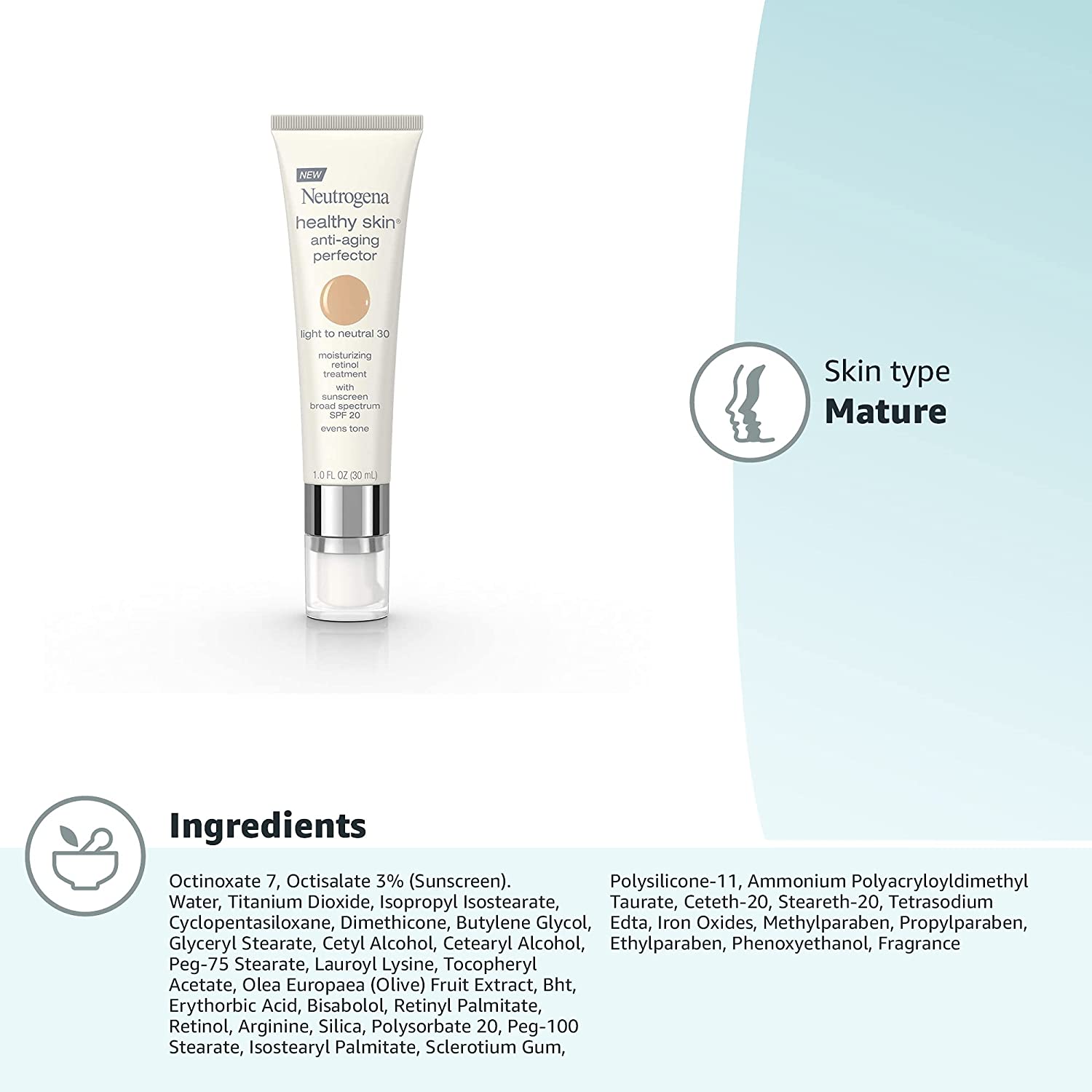 Use Neutrogena Healthy Skin Anti-Aging Perfector Tinted Facial Moisturizer with SPF 20 sunscreen to help reduce the appearance of fine lines. This all-in-one daily moisturizer combines the anti-aging properties of retinol with an SPF 20 moisturizer to offer blendable sheer coverage that helps even tone and smooth skin's texture while protecting against skin-damaging sunrays. This tinted moisturizer is enriched with clinically proven retinol treatment as well as vitamins and antioxidants to fight the appearance of wrinkles even after you take it off. Neutrogena Healthy Skin Anti-Aging Perfector SPF 20 works across skin tones for a natural, dewy finish with sheer coverage.