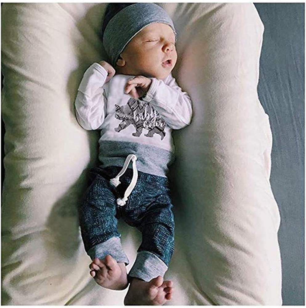 Newborn Baby Boy Clothes Baby Bear Letter Print Romper+Long Pants+Hat 3PCS Outfits Set White