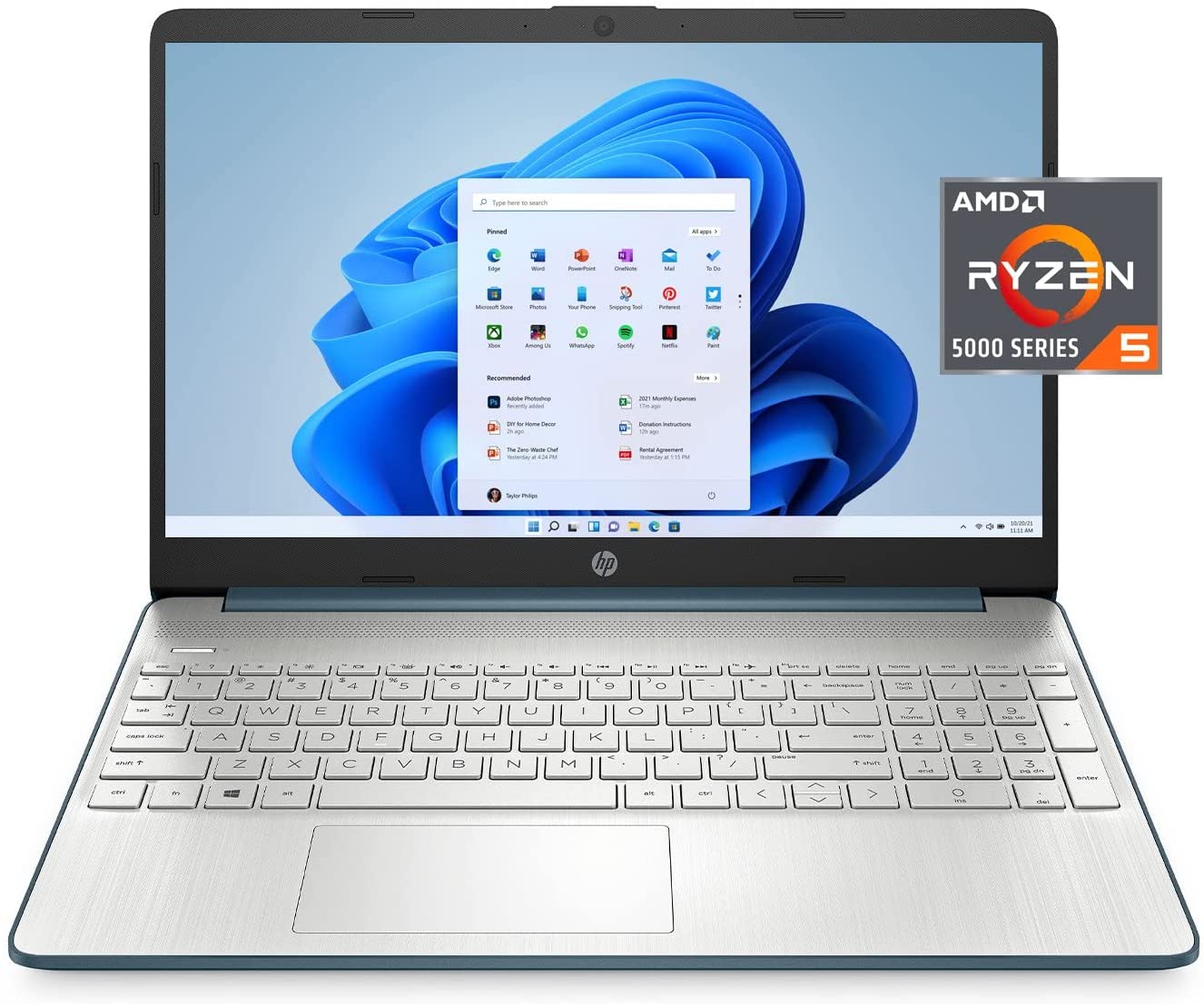Specifications Processor : AMD Ryzen 5 5500U (up to 4.0 GHz max boost clock, 8 MB L3 cache, 6 cores, 12 threads) Graphics : AMD Radeon Graphics Chipset : AMD Integrated SoC Display : 15.6" diagonal, FHD (1920 x 1080), micro-edge, anti-glare, 250 nits, 45% NTSC Operating system : Windows 11 Home Memory : Upgraded to 16GB DDR4 SDRAM Hard Drive : Upgraded to 512GB PCIe NVMe M.2 SSD Optical Drive : No Connectivity : Realtek RTL8821CE-M 802.11a/b/g/n/ac (1x1) Wi-Fi and Bluetooth 4.2 combo Audio : Dual Speakers Built-in HD Webcam : HP True Vision 720p HD camera with integrated dual array digital microphones Media Drive : 1 multi-format SD media card reader Ports : · 1 SuperSpeed USB Type-C 5Gbps signaling rate; · 2 SuperSpeed USB Type-A 5Gbps signaling rate; · 1 HDMI 1.4b; · 1 AC smart pin; · 1 headphone/microphone combo Battery :45 W Smart AC power adapter,3-cell, 41 Wh Li-ion, Up to 9 hours and 30 minutes Color : SPRUCE BLUE Dimensions L x W x H (inches) : 14.11 x 9.53 x 0.78 in Weight : 3.75 lbs