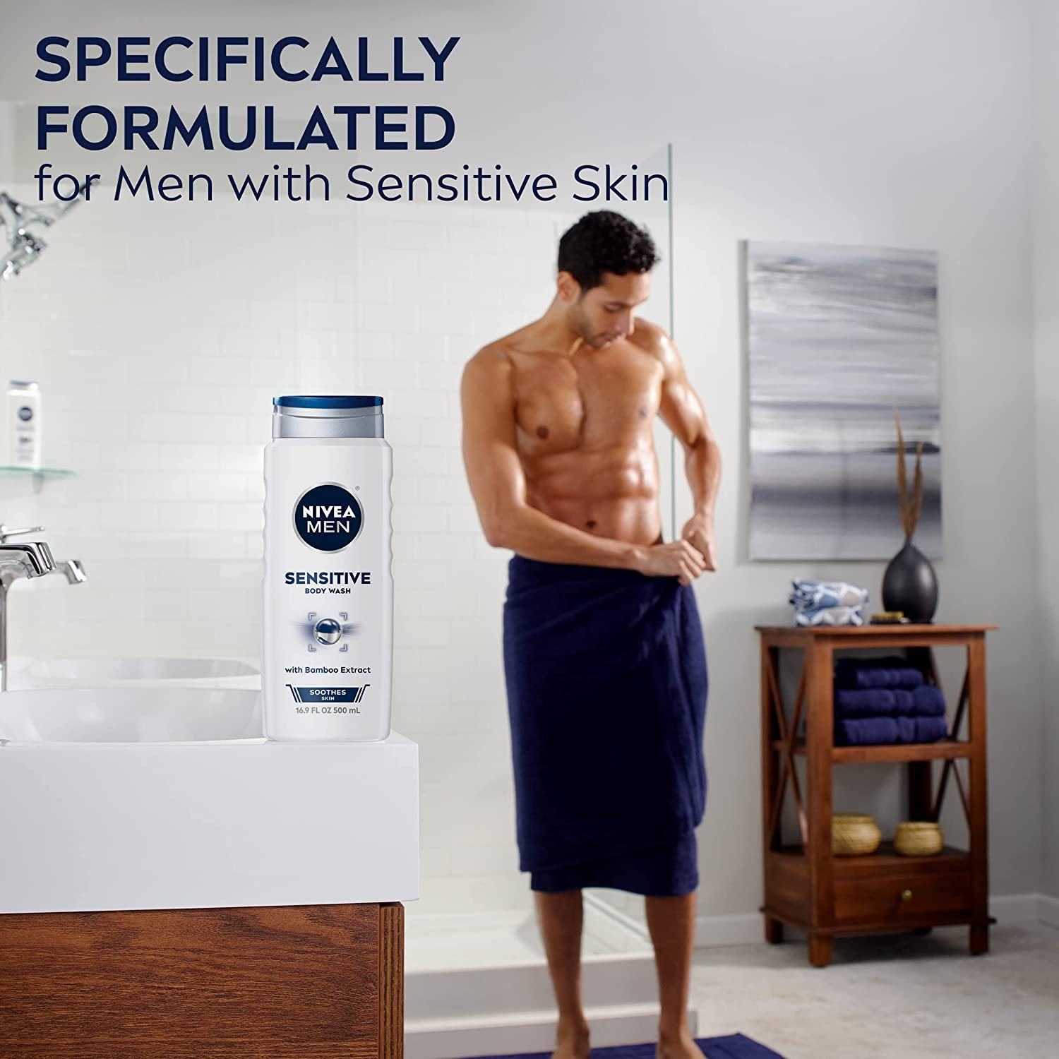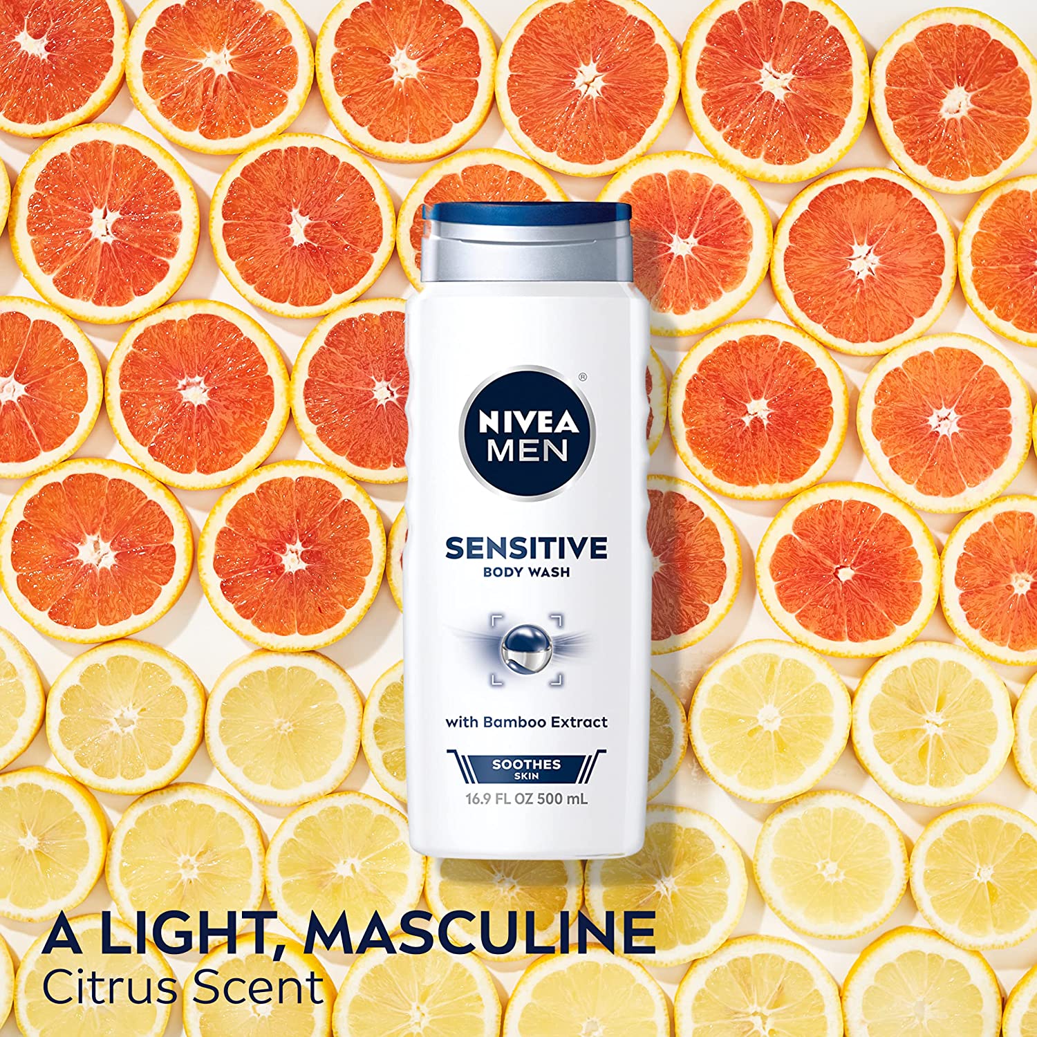 Take care of your skin with NIVEA MEN Sensitive Body Wash. This hydrating body wash is specially formulated for men with sensitive skin. NIVEA MEN Sensitive Body Wash is enriched with Bamboo Extract and Almond Oil to provide the nourishing moisture your skin needs. This NIVEA MEN body wash can be used for shaving, and as a moisturizer, shampoo and body wash. This hydrating, gently cleansing body wash for sensitive skin is also soap free with no drying alcohol. It is also free of phthalates, parabens and microplastic particles. With a light scent and citrus notes, this NIVEA body wash for men provides a revitalizing experience that leaves you feeling fresh long after the shower. A moisturizing body wash is a key part of a skin care routine and pairs well with NIVEA MEN Sensitive Protective Lotion. To use, rub sensitive body wash into a lather while gently massaging over body and rinse.