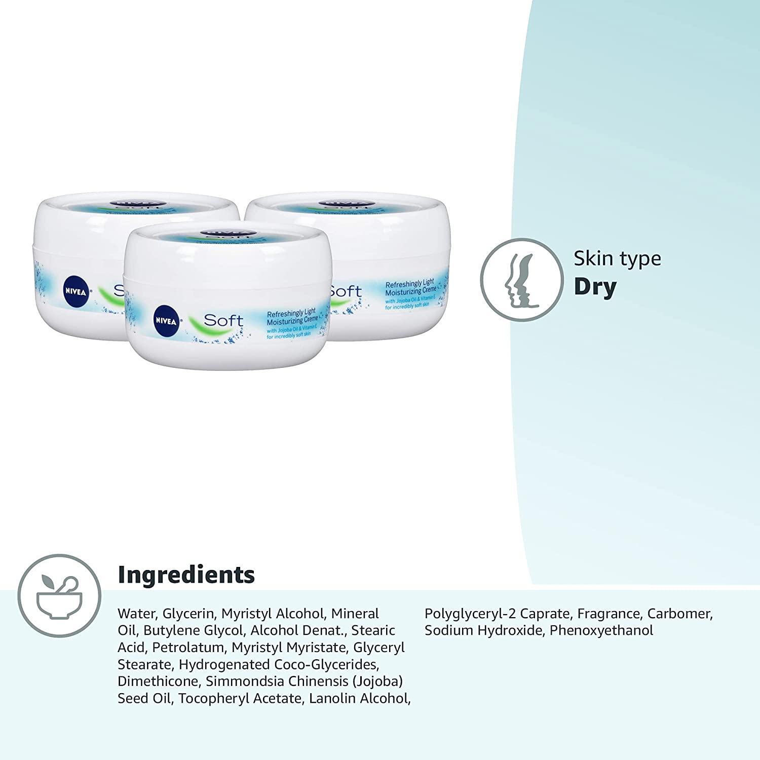 The key to soft, beautiful skin has arrived with NIVEA Soft, Refreshingly Soft Moisturizing Cream. NIVEA Soft is an all-in-one refreshing body cream, face moisturizer and hand cream that delivers long-lasting moisture and soft, supple skin. NIVEA Soft has a refreshingly light formula enriched with Jojoba Oil and Vitamin E for softer, smoother skin without that greasy feel. This fast absorbing moisturizer is perfect for all skin types. Complete your hand washing routine with NIVEA Soft cream and give dry hands the soothing skincare they deserve. To use, smooth NIVEA Soft, Refreshingly Soft Moisturizing Cream onto your skin daily. For best results, apply after showering. NIVEA is proud to be one of the leading companies in the field of skin care products, with more than 130 years of expertise.