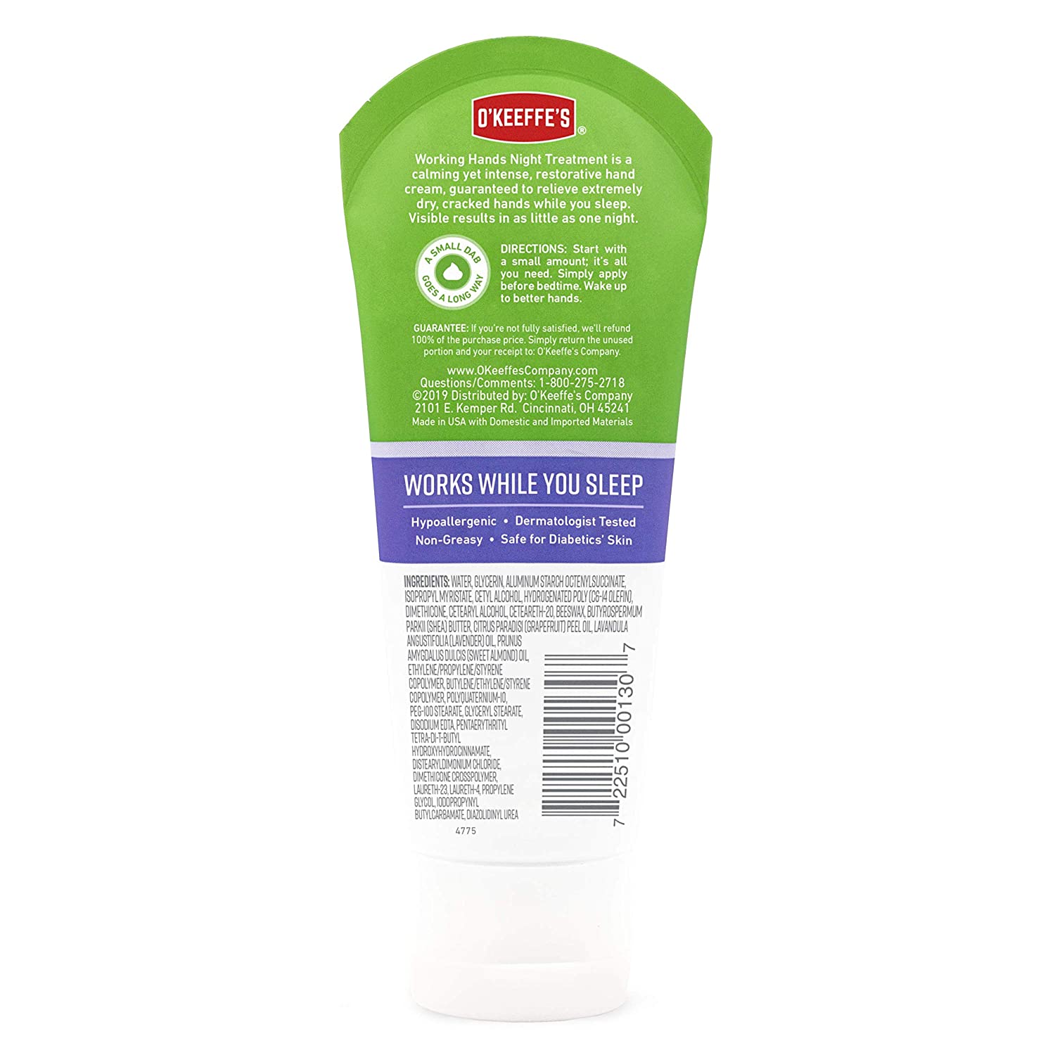 O’Keeffe’s Working Hands Hand Cream is a concentrated, unscented hand cream that heals, relieves and repairs extremely dry, cracked hands. When used daily, O’Keeffe’s Working Hands Hand Cream is clinically proven to instantly boost moisture levels, help prevent further moisture loss, create a protective barrier on the skin’s surface, and make a difference you will feel within days. O’Keeffe’s Working Hands Night Treatment is a calming yet intense, restorative hand cream that is to relieve extremely dry, cracked hands while you sleep. Visible results in as little as one night.
