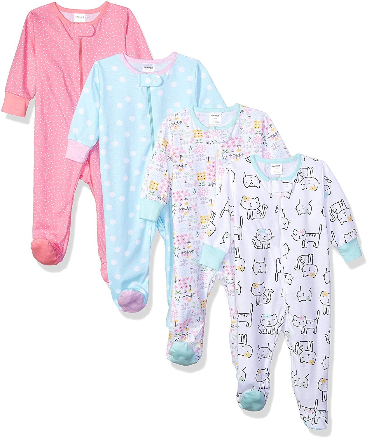 Wrap your little girl in cozy comfort with this 4-pack of baby girls' sleep n' plays! they're made using 100 percent cotton jersey that provides both warmth and breathability. It's perfect for keeping her feeling happy during all of the day's activities. The whimsical assortment of prints and patterns follow a central theme that's designed to delight little ones. The convenience of the front zipper opening makes diaper duty and dressing easier. A zipper neck cover protects her chin from scratches. Easy care fabric helps to lighten the load on busy laundry days