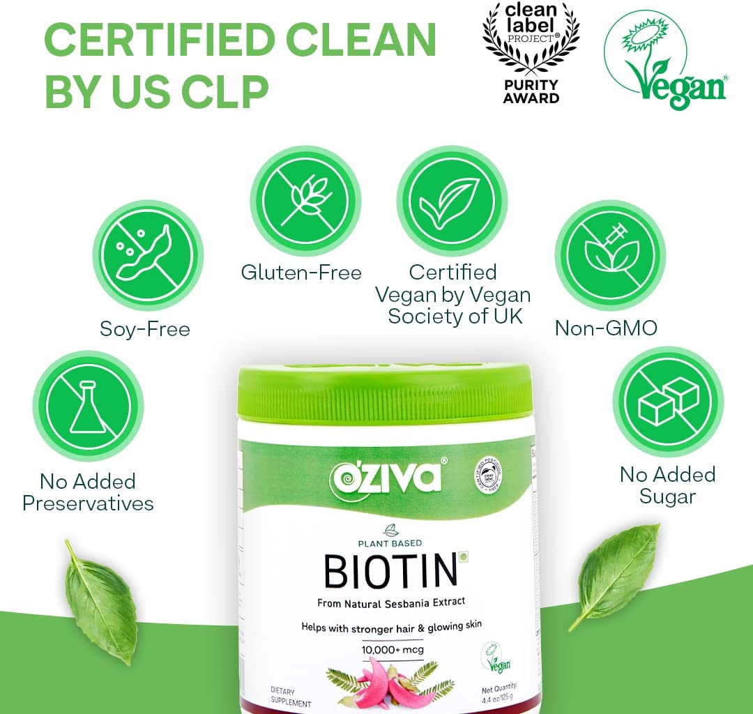 OZiva Plant Based Biotin for Hair Growth| Biotin Powder for Hair Follicle Stimulation & Healthier Texture, Skin, Nails & Body (with Silica, Sesbania Agati), Certified Clean & Vegan, 125g