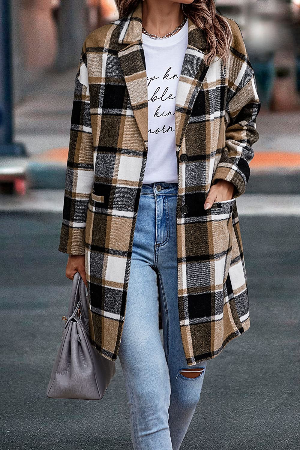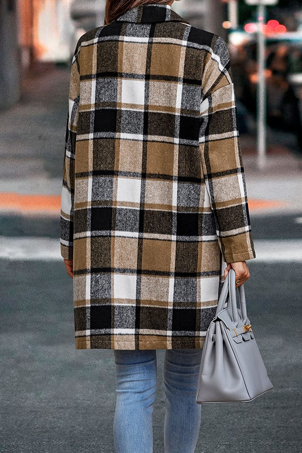 PRETTYGARDEN Women's Plaid Shacket Jacket Casual Button Lapel Wool Blend Tartan Trench Coat With Pockets