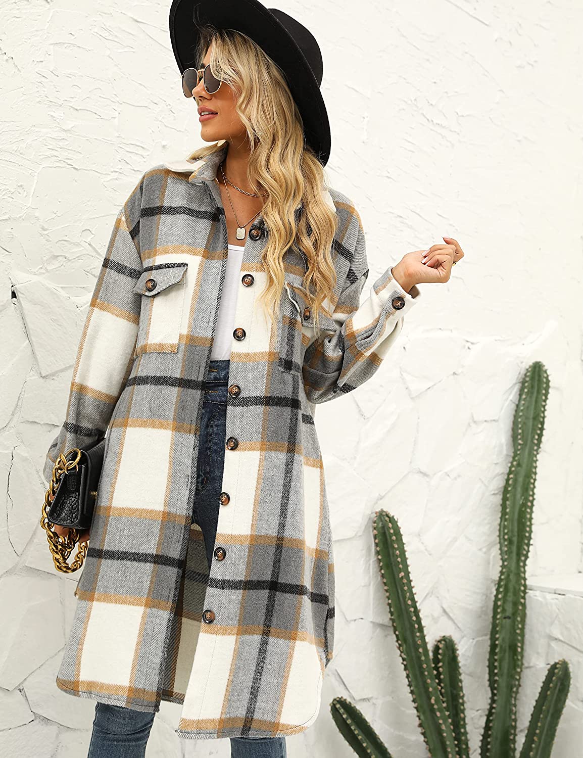 PUWEI Women's Long Flannel Plaid Jacket Shacket Cozy Lapel Button Down Shirt Jacket Fuzzy Trench Coat