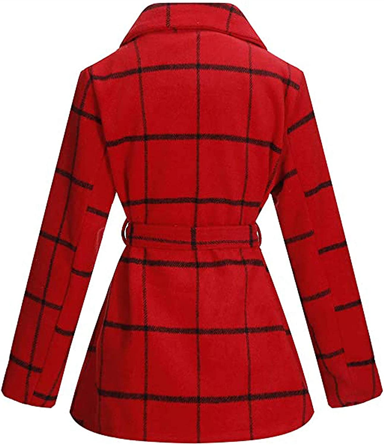QZUnique Trench Coat Women Turn Down Collar Wrap Coat Wool Blend Grid Belted Outwear Asymmetric Hem Winter Pea Coats