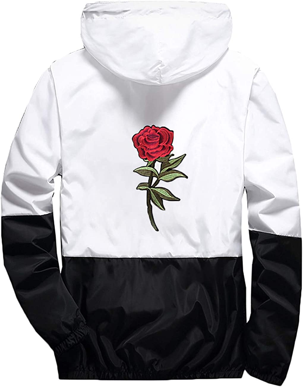 Rexcyril Men's Rose Floral Windbreaker Hooded Jacket Lightweight Casual Full Zip Flower Coat