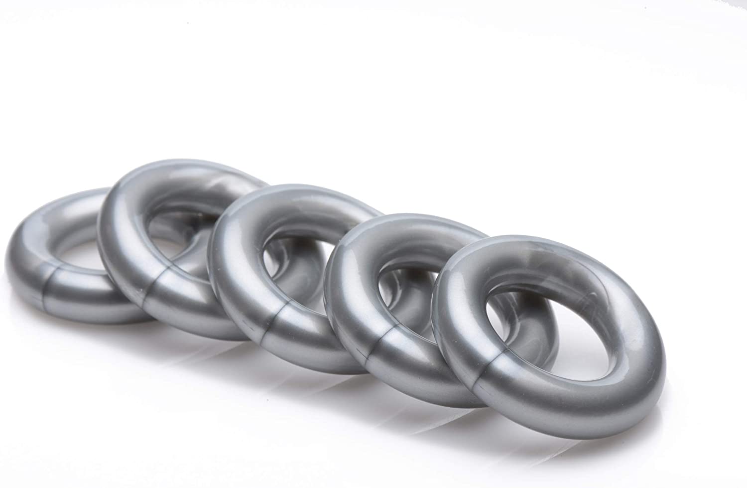 Discover new levels of pleasure with this customizable ball-stretching kit! Perfect for both beginners and those who want to push their limits, this set of 5 stretchy rings allows you to add tension one ring at a time. Find the perfect tugging sensation as your scrotum is pulled downward more and more with each ring you add. For even more excitement, use one as a cock ring to keep your member hard and pulsing with sensitivity while your balls are stretched.This ultra stretchy material provides convenience and a comfortable fit. It is compatible with both silicone and water-based lubricants. Clean after use with mild soap or toy cleaner.Measurements: Each ring is 1 inch in diameter, unstretchedMaterial: TPRColor: GreyNote: Includes 5 rings