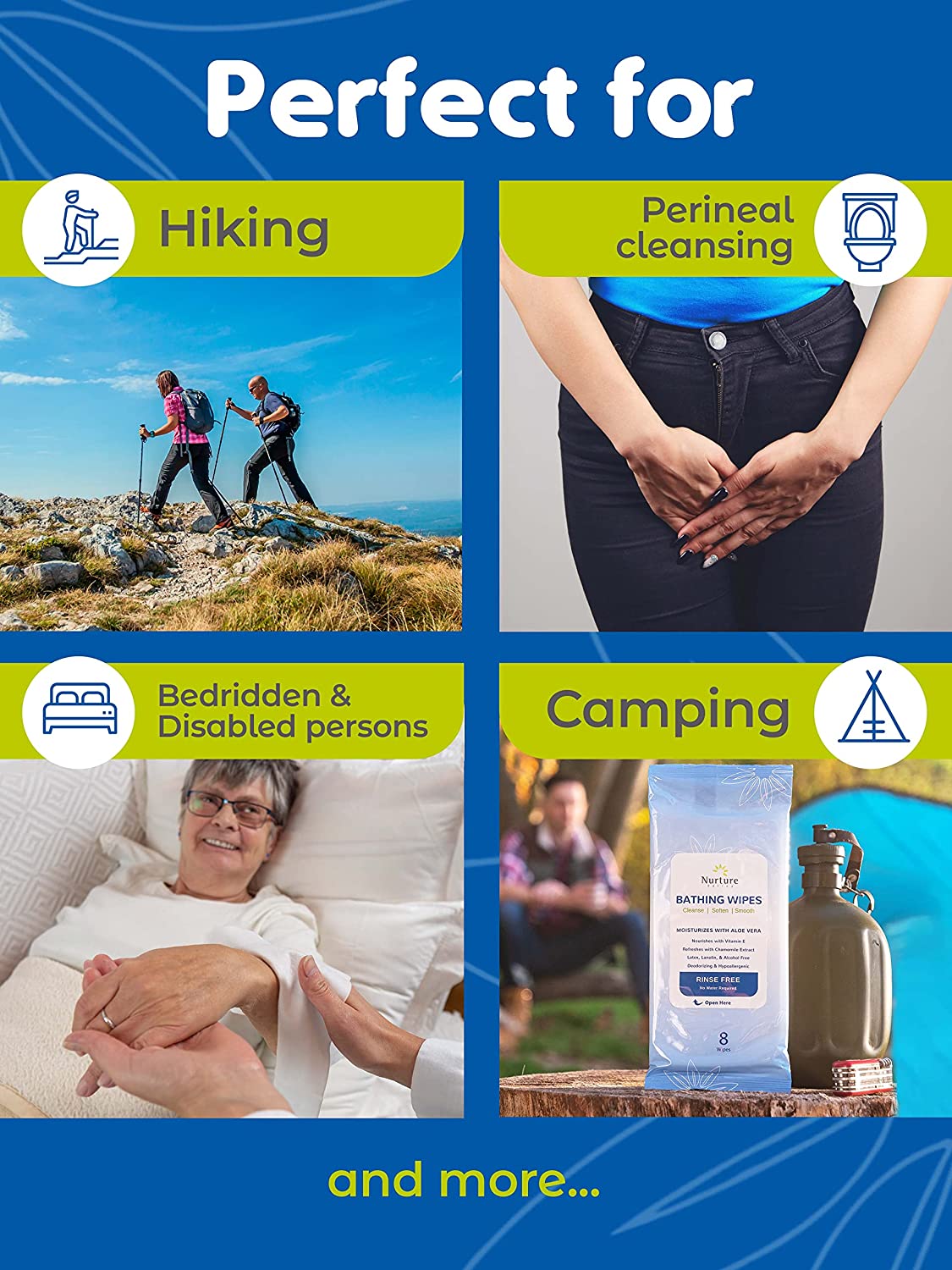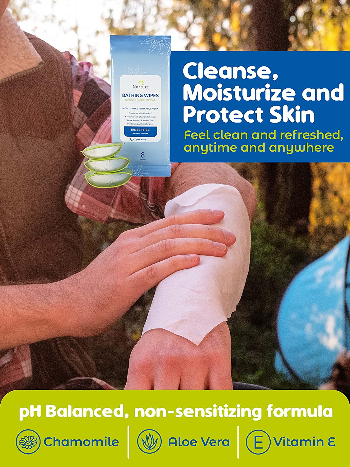 Rinse Free No Shower Bathing Wipes (8-Pack) | 64 Microwavable Adult Cleansing Body Bath Wash Cloths with Aloe Vera & Vitamin E - No Water Required - Latex Lanolin & Alcohol Free - 8 Packs of 8 Wipes