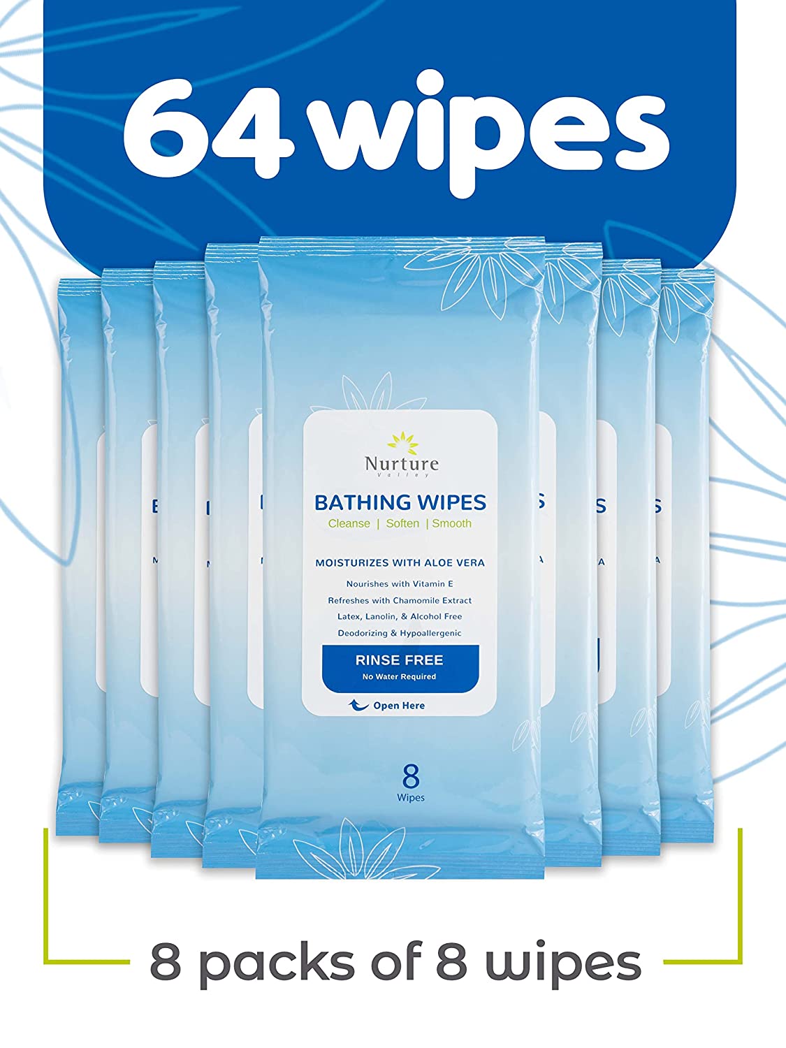 Rinse Free No Shower Bathing Wipes (8-Pack) | 64 Microwavable Adult Cleansing Body Bath Wash Cloths with Aloe Vera & Vitamin E - No Water Required - Latex Lanolin & Alcohol Free - 8 Packs of 8 Wipes