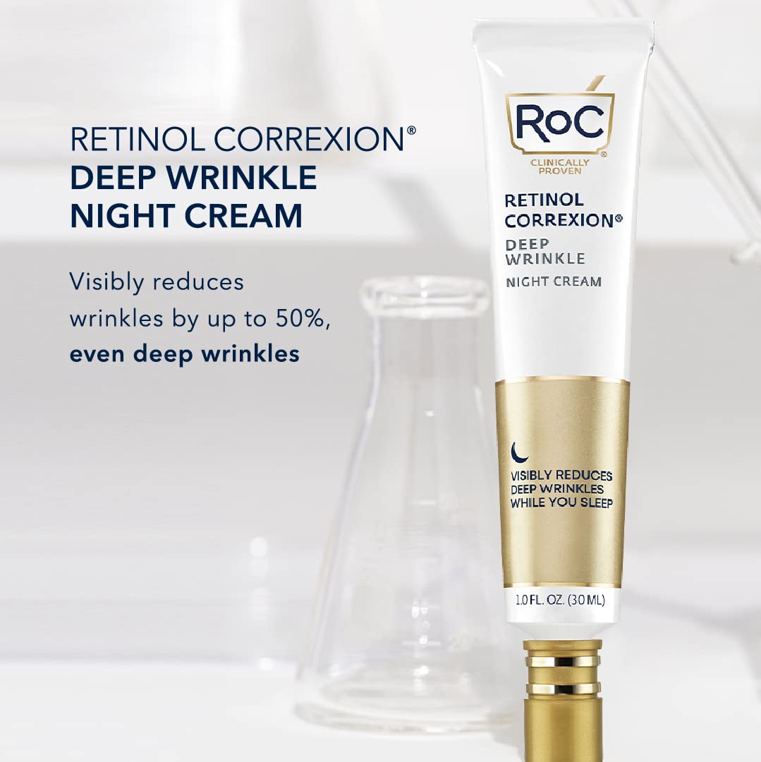 RoC Retinol Correxion Deep Wrinkle Night Cream visibly reduces the look of lines and deep wrinkles on your face while you sleep. This anti aging cream, containing pure RoC Retinol, leaves skin feeling smooth and younger looking. Tested by dermatologists and clinically proven to visibly reduce the look of both fine lines and deep wrinkles in 12 weeks, RoC Retinol Correxion Deep Wrinkle Night Cream is oil free and non comedogenic.