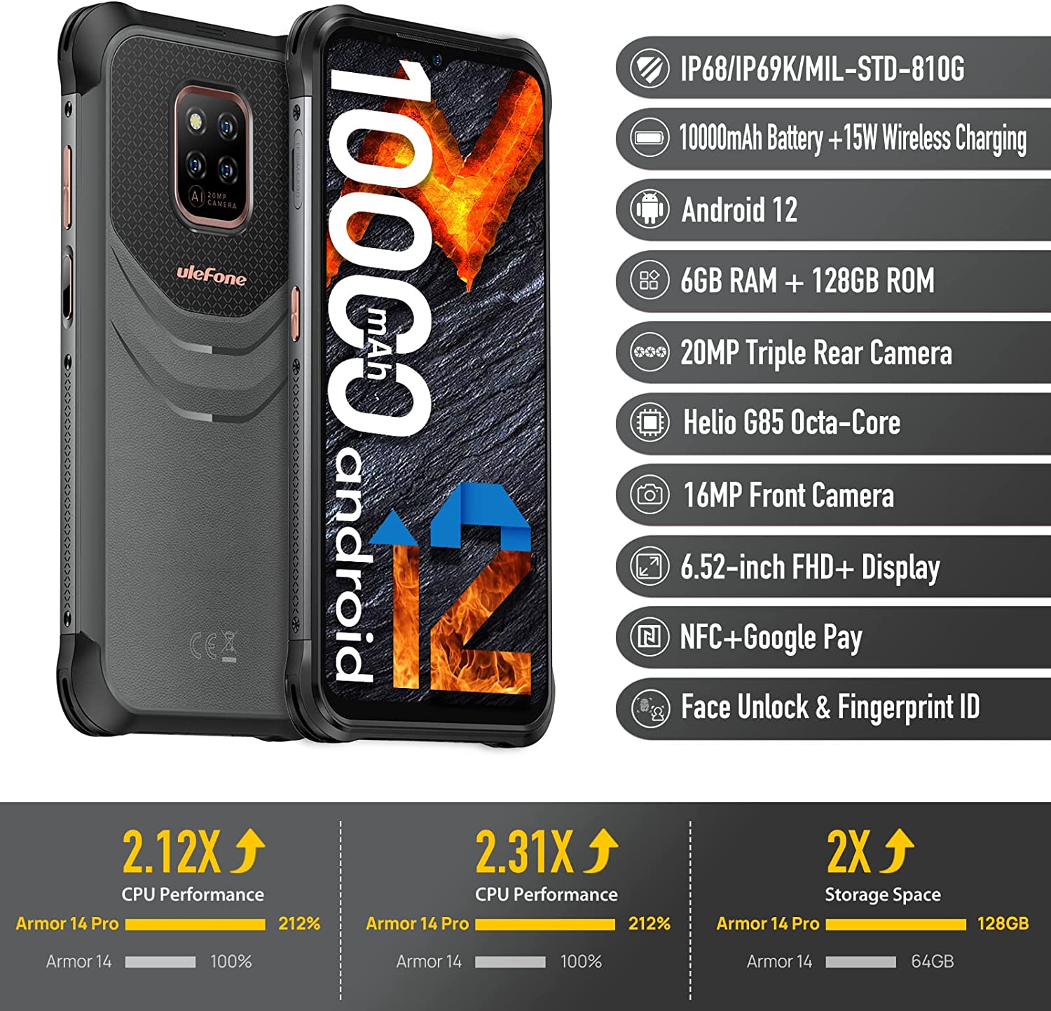 Rugged Phones, Ulefone Power Armor 14 Pro 10000mAh, Android 12, 6GB+128GB, Helio G85 Octa-core Waterproof Rugged Smartphone, 6.52” HD+, 20MP AI Camera, Fast Charging Unlocked Cell Phone Dual Sim 4G