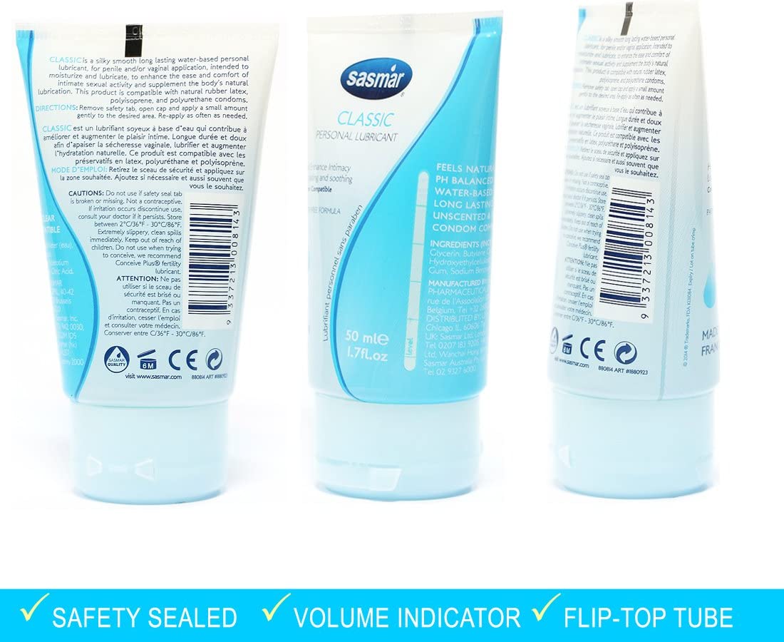 Sasmar Classic is an excellent water based lubricant that men and women can both enjoy for either sexual intercourse or solo play without concerns about irritation or it getting sticky. Water-soluble and safe for use with toys, clear clean and non staining lube that feels great and suitable for daily use.
