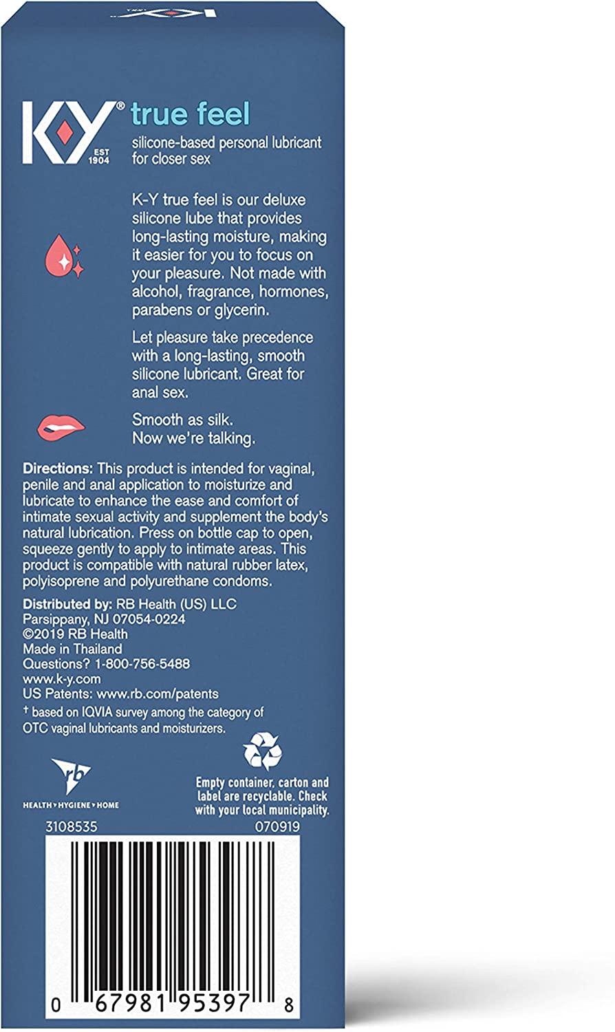 K-Y True Feel Premium Silicone Lube is a long lasting personal lubricant that helps you feel close and natural to your partner. From K-Y, the #1 Doctor Recommended Brand. Do not use if quality seal on the opening of the tube is broken or missing.