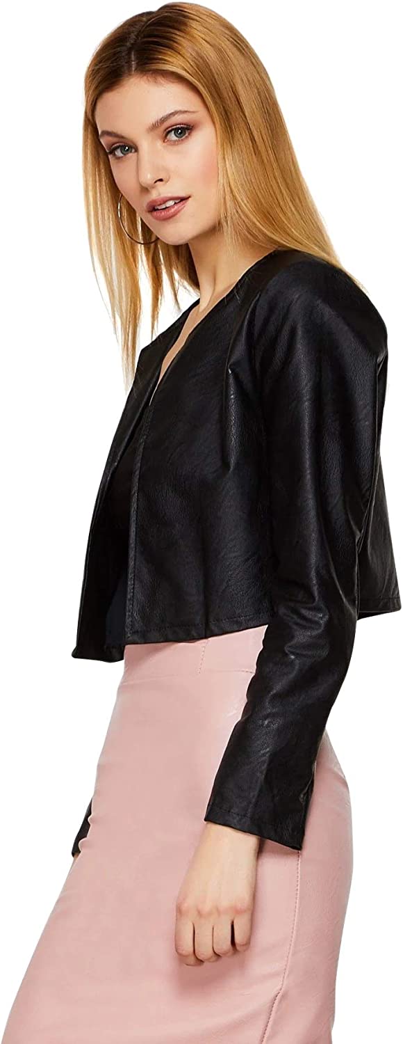 SheIn Women's Open Front Casual PU Leather Cropped Jacket Long Sleeve Bolero