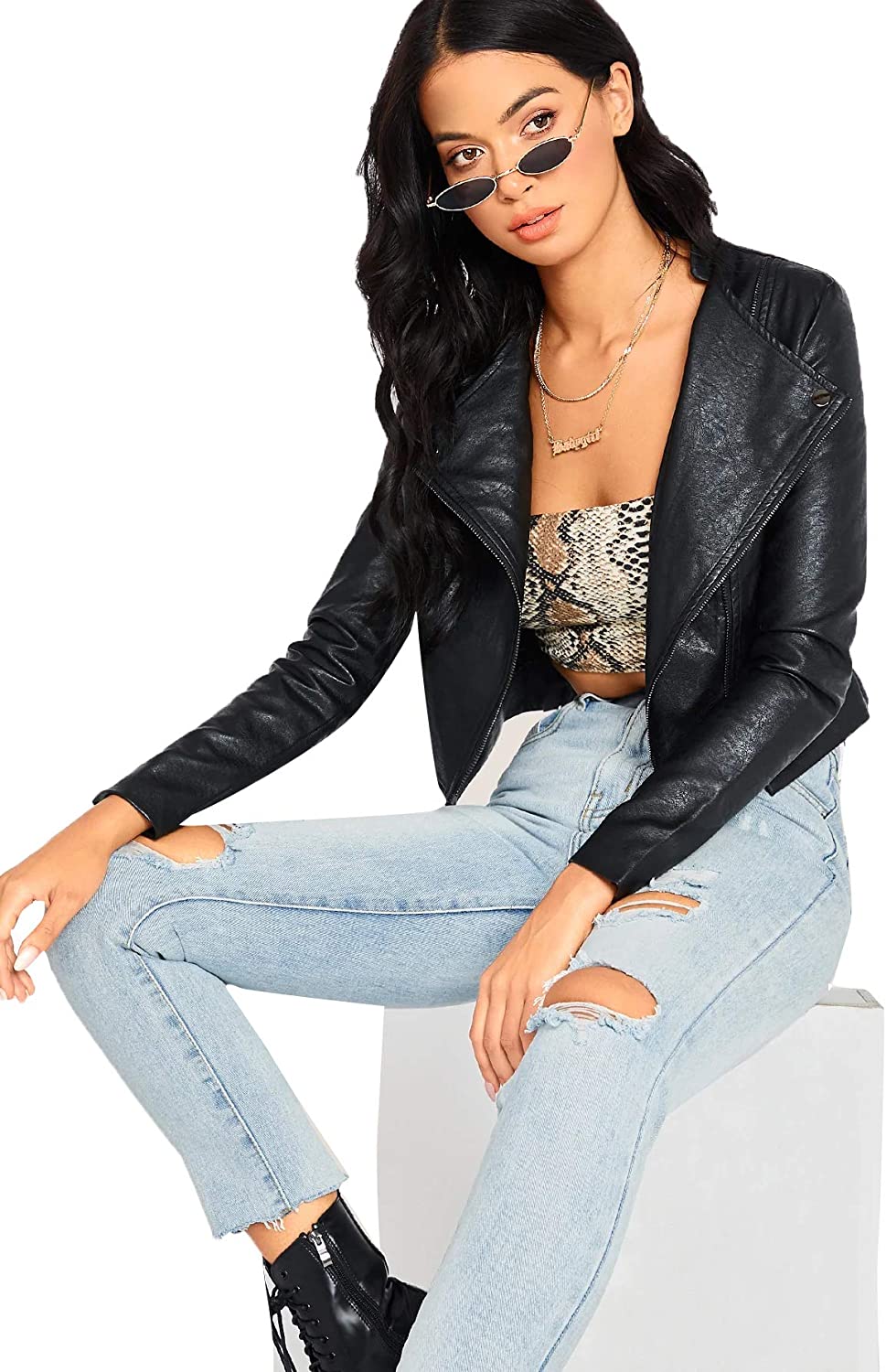 SheIn Women's Zipper Front Casual PU Leather Cropped Jacket Long Sleeve Bolero