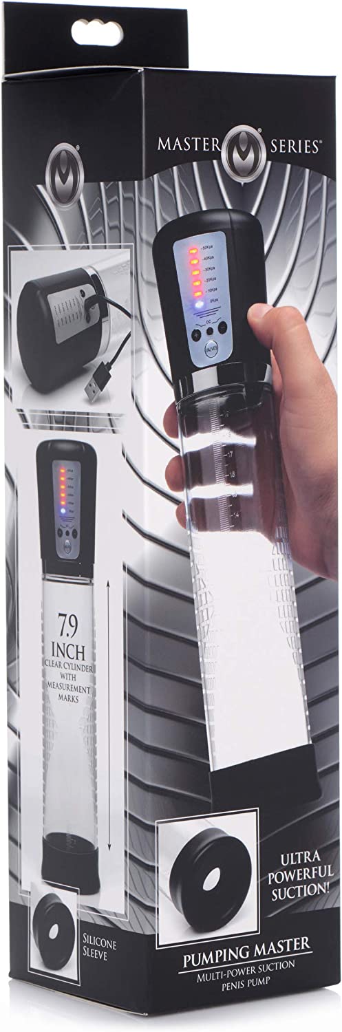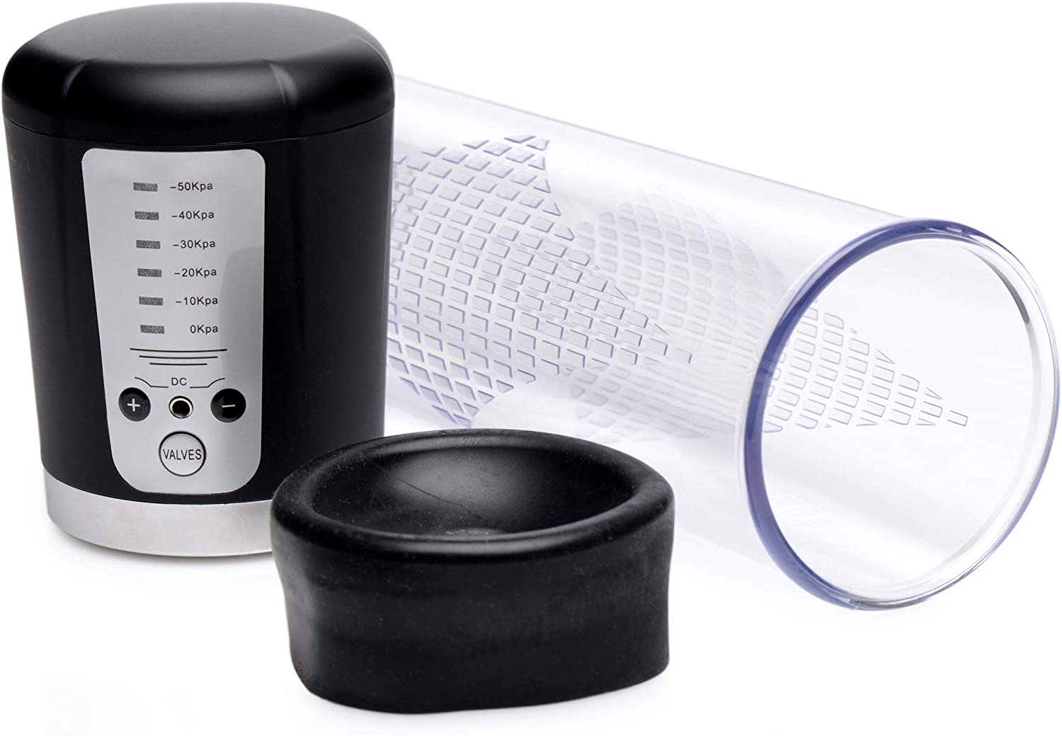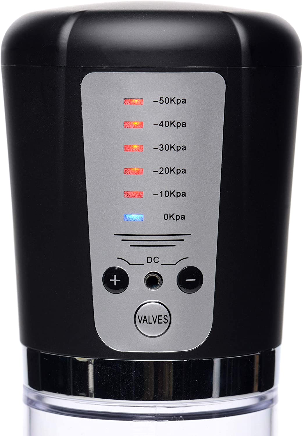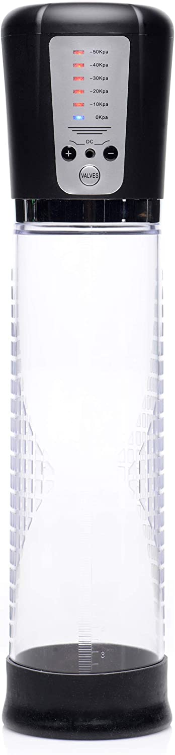 This automatic penis pump is easy-to-use, but packs a ton of power! Treat yourself or your partner to a penis that is swollen with sensitivity with this rechargeable, all-in-one pump! Slide into the silicone sleeve using a little water-based lube for sleekness. The tight opening will create a seal around your penis so that pressure can build within. The cylinder is textured for a firm grasp, clear so that you can watch yourself grow, and marked with measurements so that you can track your progress! Explore 5 levels of suction, finding your perfect amount of pressure with the plus and minus buttons. The easy-to-read Display will tell you how many pascals of internal pressure you are vacuuming your penis with. When you have had enough, a pressure release valve button will release the pressure so that you can play with your erection! Measurements: 11.5 inches in total length, 8 inches insertable cylinder Depth, 2.35 inches in diameter. Silicone opening is .75 inches in diameter, unstretched. Hose is 8.75 inches in length. Material: ABS, silicone. Color: Clear. Note: Charges via USB