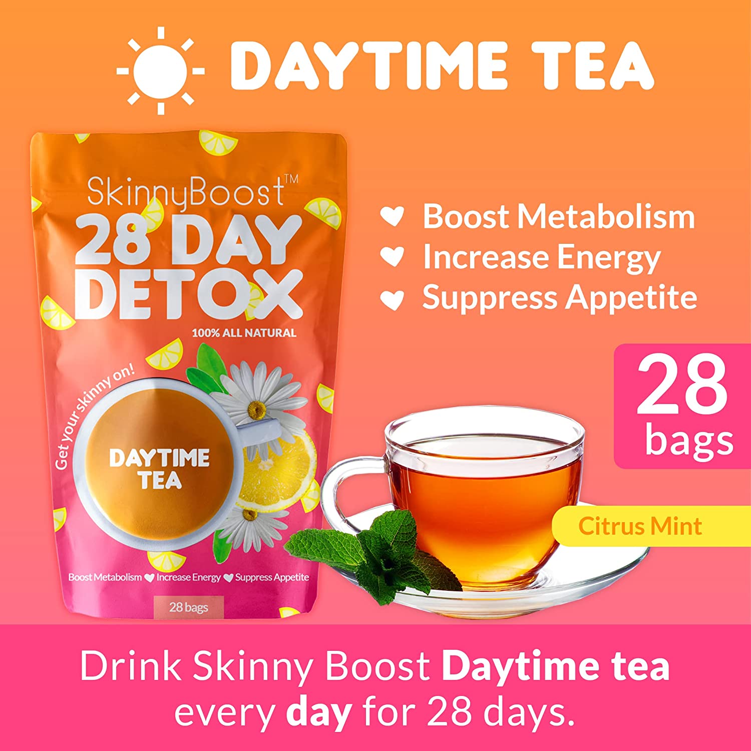 Skinny Boost Tea Kit-1 Daytime Tea (28 Bags) 1 Evening Detox Tea (14 Bags), Lean Greens Plus Superfood Powder, Palm Tumbler, Non GMO, Vegan, All Natural Detox and Cleanse