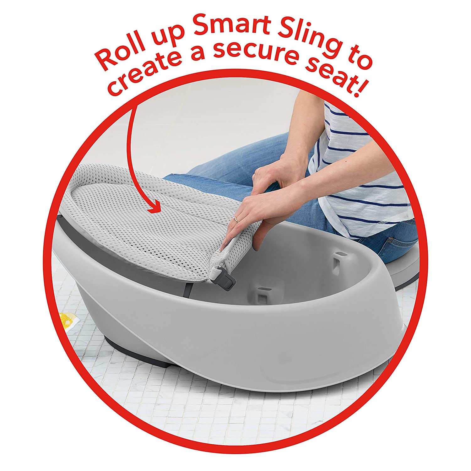 Our cheerful whale-shaped Moby tub grows with baby through three stages and offers Smart Sling™ support. The sling locks into two ergonomic positions: higher for full-body support and lower for seated support. Dual layered mesh and comfort-edge construction securely cradles baby from head-to-toe. The slings adjusts to a cushioned seat that comfortably supports babies learning to sit. Remove the sling when baby has mastered sitting and easily bathe baby in the spacious tub—no uncomfortable plastic bumps.