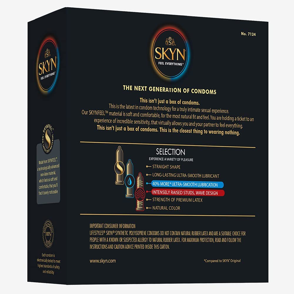 SKYN Premium Polyisoprene Lubricated Condoms easily stretch and conform to your shape so that they are comfortable to use. They're also free from allergens, making them a safe choice. These non-latex lubricated condoms feel soft and natural and provide an extraordinary experience.