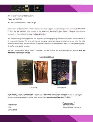 You can ask the sellers for Virtual ID for authentication verification SLIMMING-K Coffee by Madam Kilay, Fat Burner + Collagen Mix Drinks - 21g x 20 Sachets Ingredients: Coffee, Non-dairy creamer, Stevia, L-Carnitine, Garcinia Cambogia, Collagen, Panax Ginseng, Aloe Vera Extract, African Mango Extract, L-Glutathione. Directions: Empty contents of one sachet into a glass. Pour 150ml of cold or hot water and stir until completely dissolved. For best results, drink warm water first thing in the morning then Slimming-K coffee 30 minutes before a meal. Can be taken up to 4x a day. Results may vary from person to person. NO APPROVED THERAPEUTIC CLAIMS.