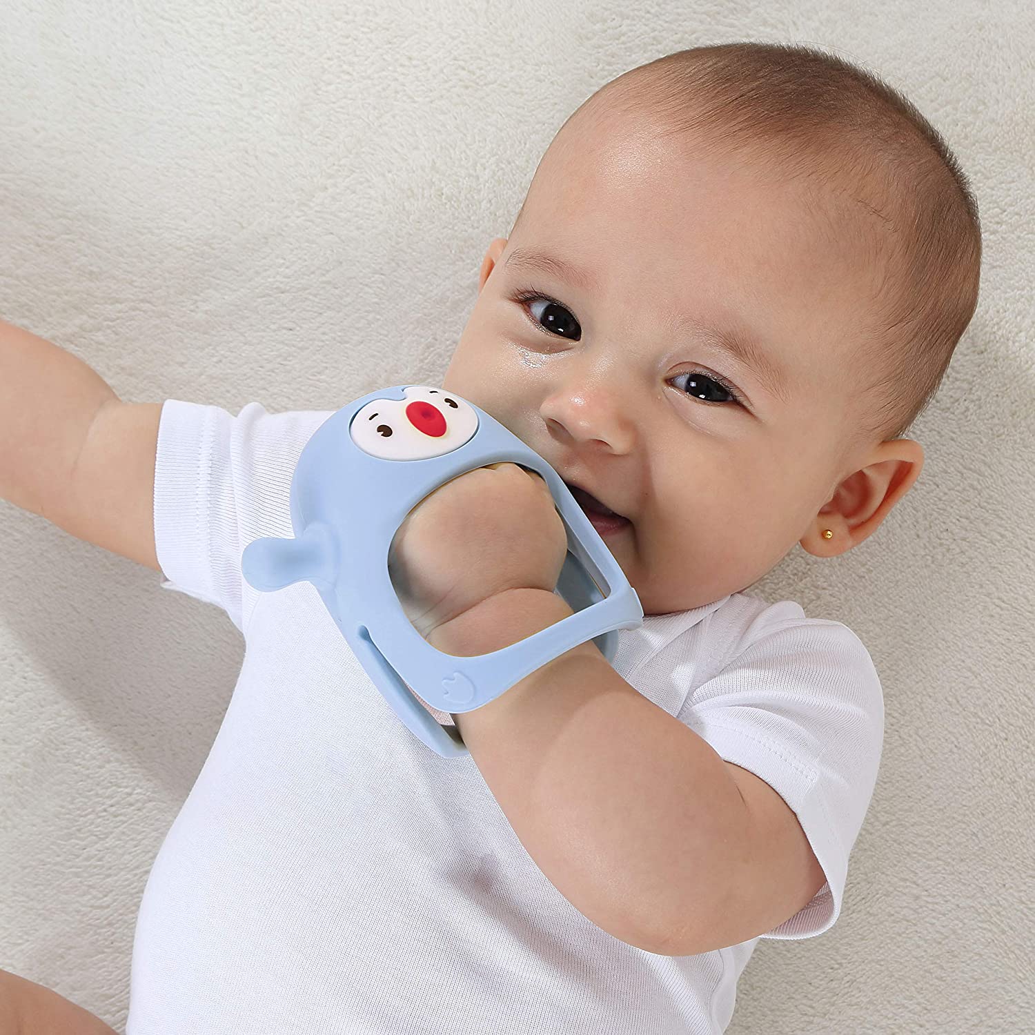 Smily Mia Penguin Buddy Never Drop Silicone Baby Teething Toy for 0-6month Infants, Baby Chew Toys for Sucking Needs, Hand Pacifier for Breast Feeding Babies, Car Seat Toy for New Born,Light Blue