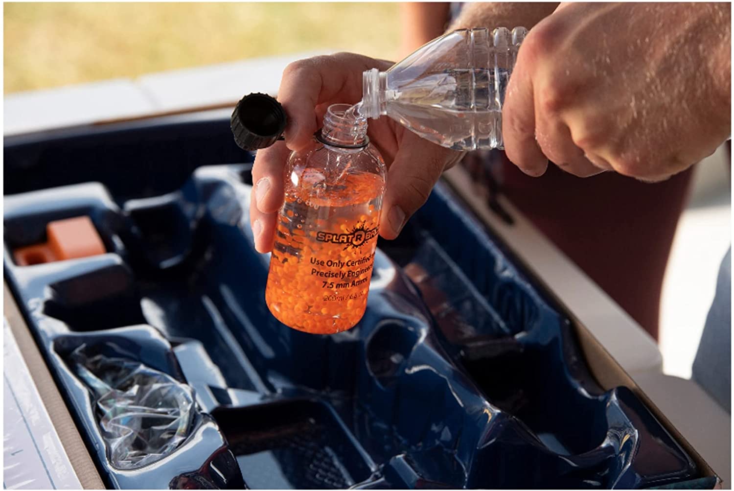 SPLATRBALL everything in your path with full auto water bead fire rate and a 1,200 round drum magazine! The SPLATRBALL SRB1200 Full Auto Water Bead Blaster shoots up to 210 feet per second (fps) SPLATRBALL ammo. It has a drum magazine with 1,200 round capacity. Shoots Certified 7.5mm SPLATRBALL water bead ammo at fire rate. This kit contains one Blaster, 1,200 round drum magazine, detachable stock, 6,000 rounds of SPLATRBALL water beads, rechargeable 7.4V 1800mAh battery with charging cable (up to 5,000 shots per battery charge), SPLATRBALL collapsible funnel for magazine quick loading, safety glasses and one water activated target.