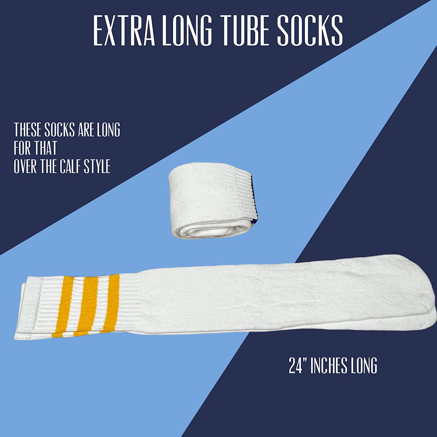 Five Pairs of Classic Tube Socks in Colors Red Blue Green Black and Yellow - Three Stripe Design and these Socks are long Knee High Style Measuring at 24" Inches in Length. High Cotton Blend Material for Comfort and Durability