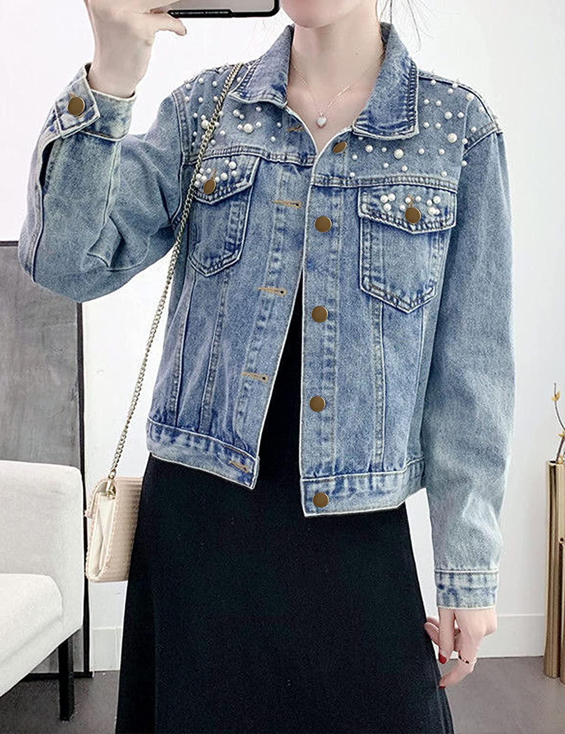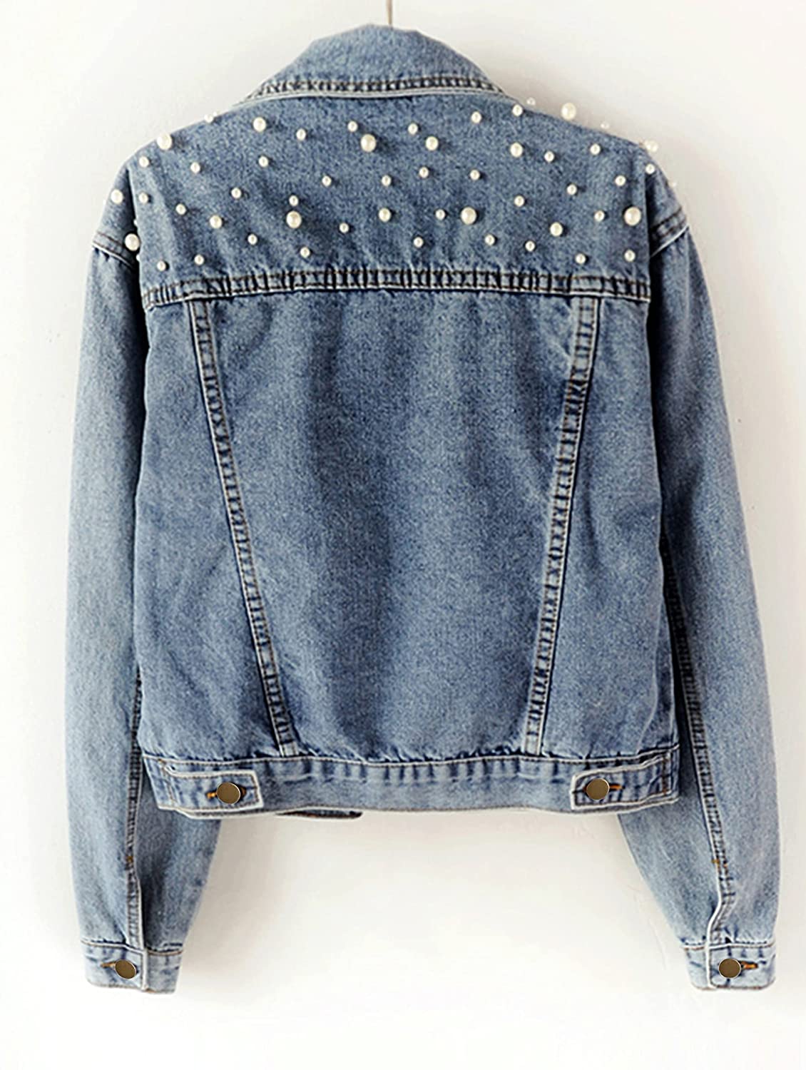 Tanming Women's Casual Embroidered Pearls Beading Denim Jacket Jean Coat
