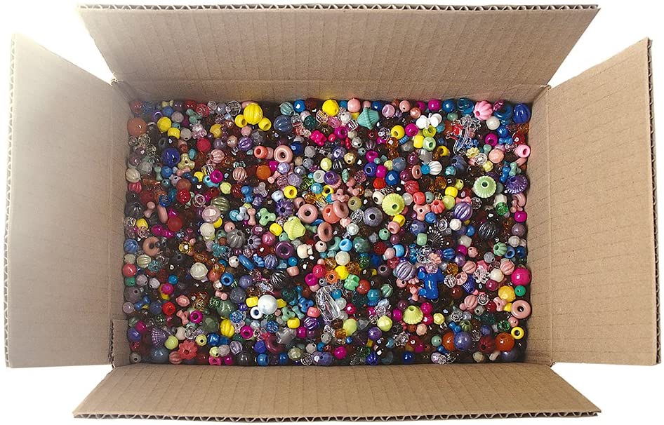 A 5lb. mix of assorted plastic craft beads, mixed shapes and colors. May contain pony beads, tri beads, faceted beads novelty beads and more. Perfect for any group craft. Made in USA. Assorted shapes and colors