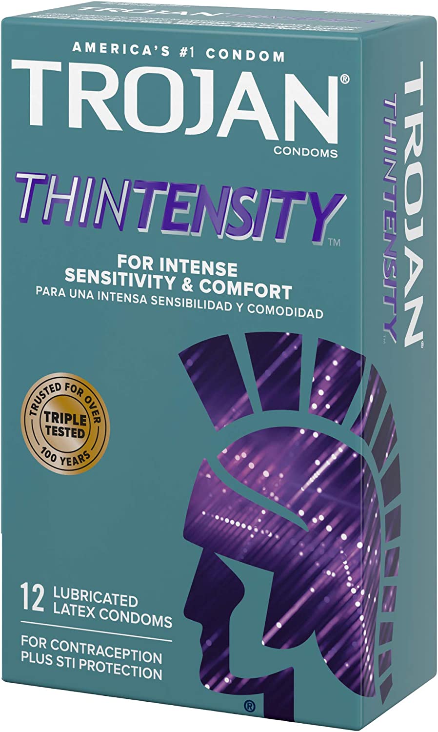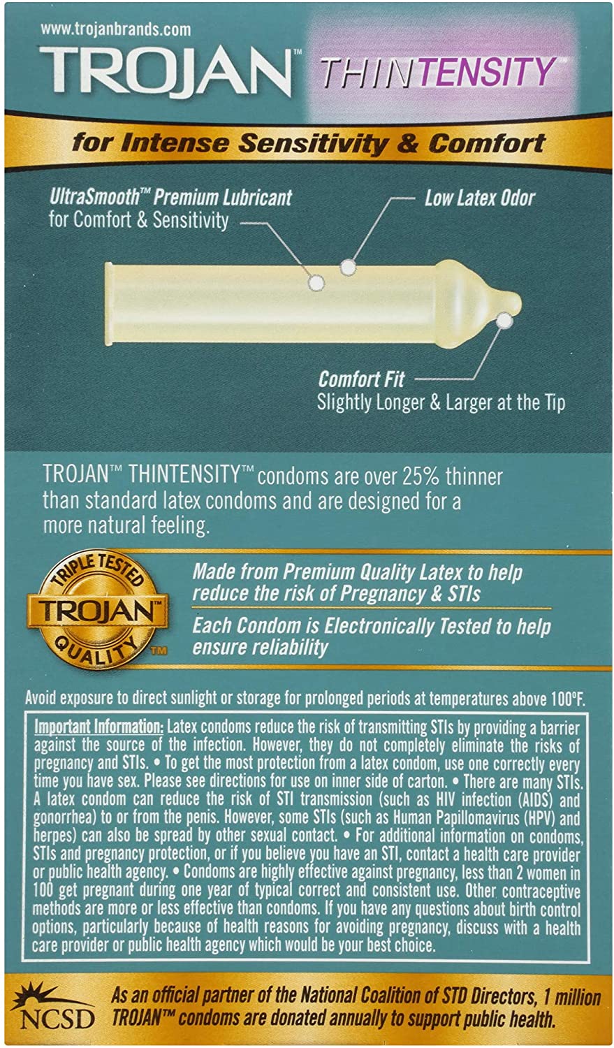 TROJAN Thintensity Condoms are ultra thin with a roomier shape for intense sensitivity. These condoms are over 25% thinner than standard condoms – giving both partners a more natural sensation. The comfort fit design is slightly longer and slightly larger at the closed end so you can get closer and experience enhanced intimacy, whenever the mood hits. Plus, UltraSmooth premium lubricant adds even more comfort and sensitivity. They’re made from a premium quality latex and are electronically tested to help ensure reliability. These condoms reduce the risk of unintended pregnancy and sexually transmitted infections (STIs) while you play. For extra safety, there is a special reservoir end. Includes one 12 count box of TROJAN Thintensity Condoms. TROJAN Brand condoms are America's #1 condom, trusted for over 100 years. The TROJAN Brand promotes a safe, healthy, and fun sex life. From condoms to vibrators to lubricants, TROJAN Brand is dedicated to delivering innovative, high-quality products that offer pleasure and protection.