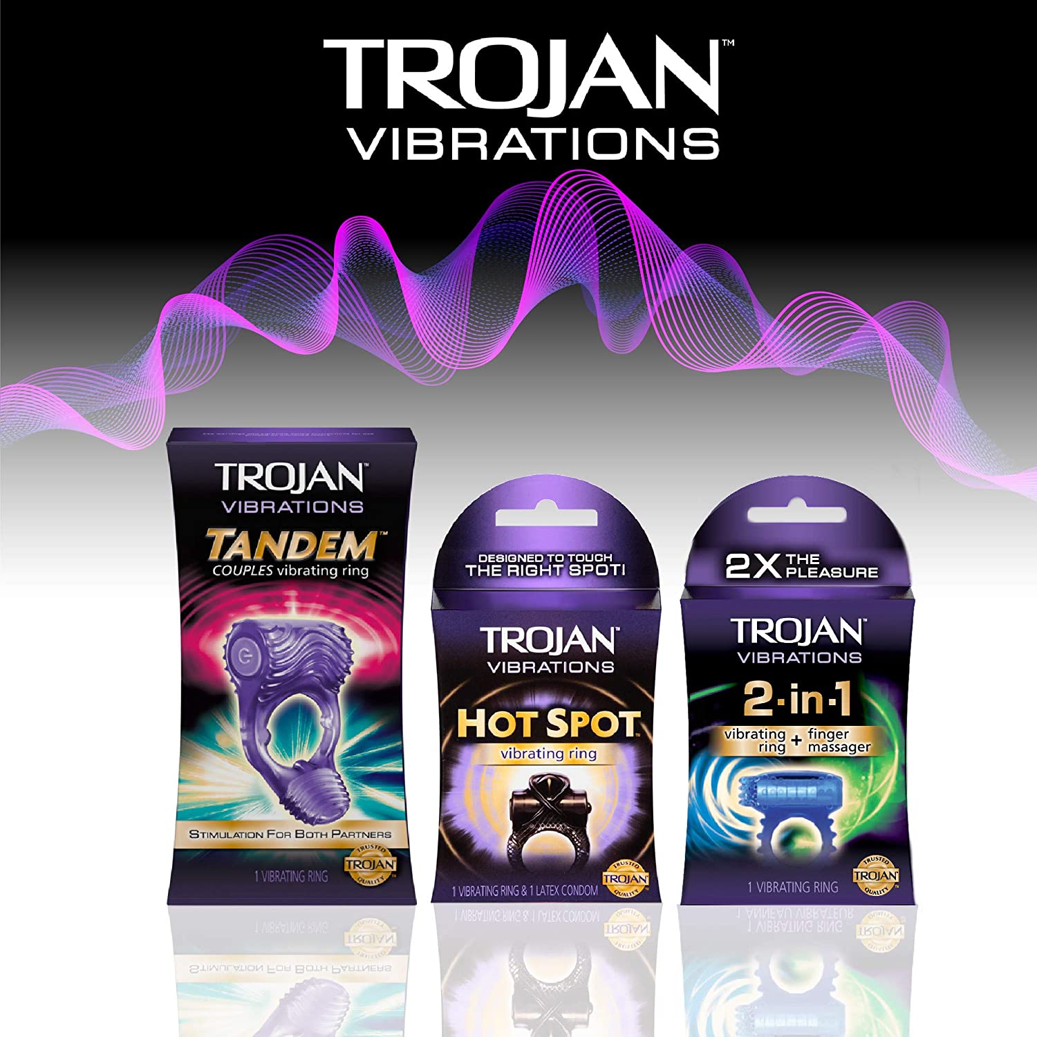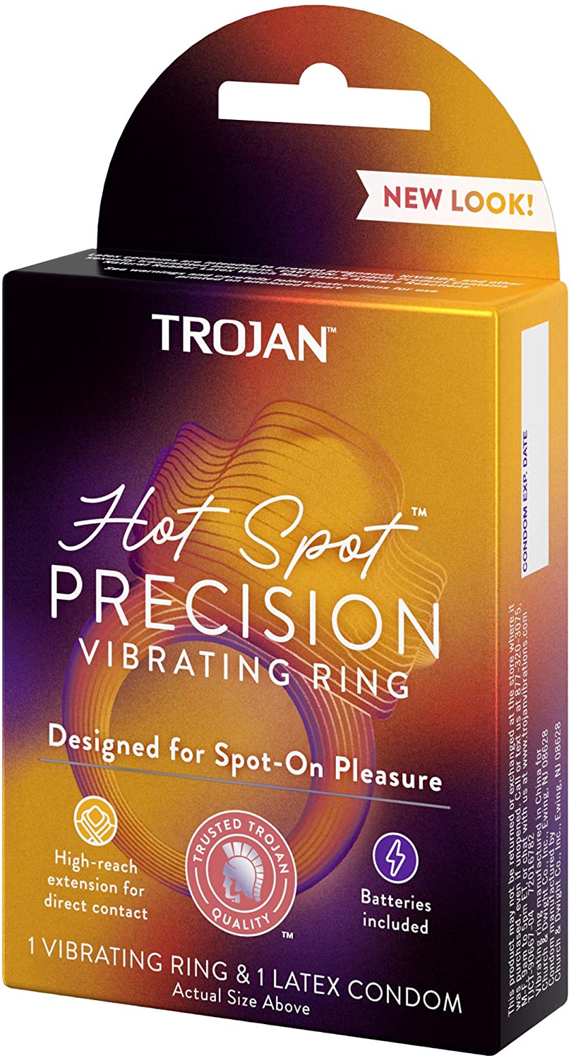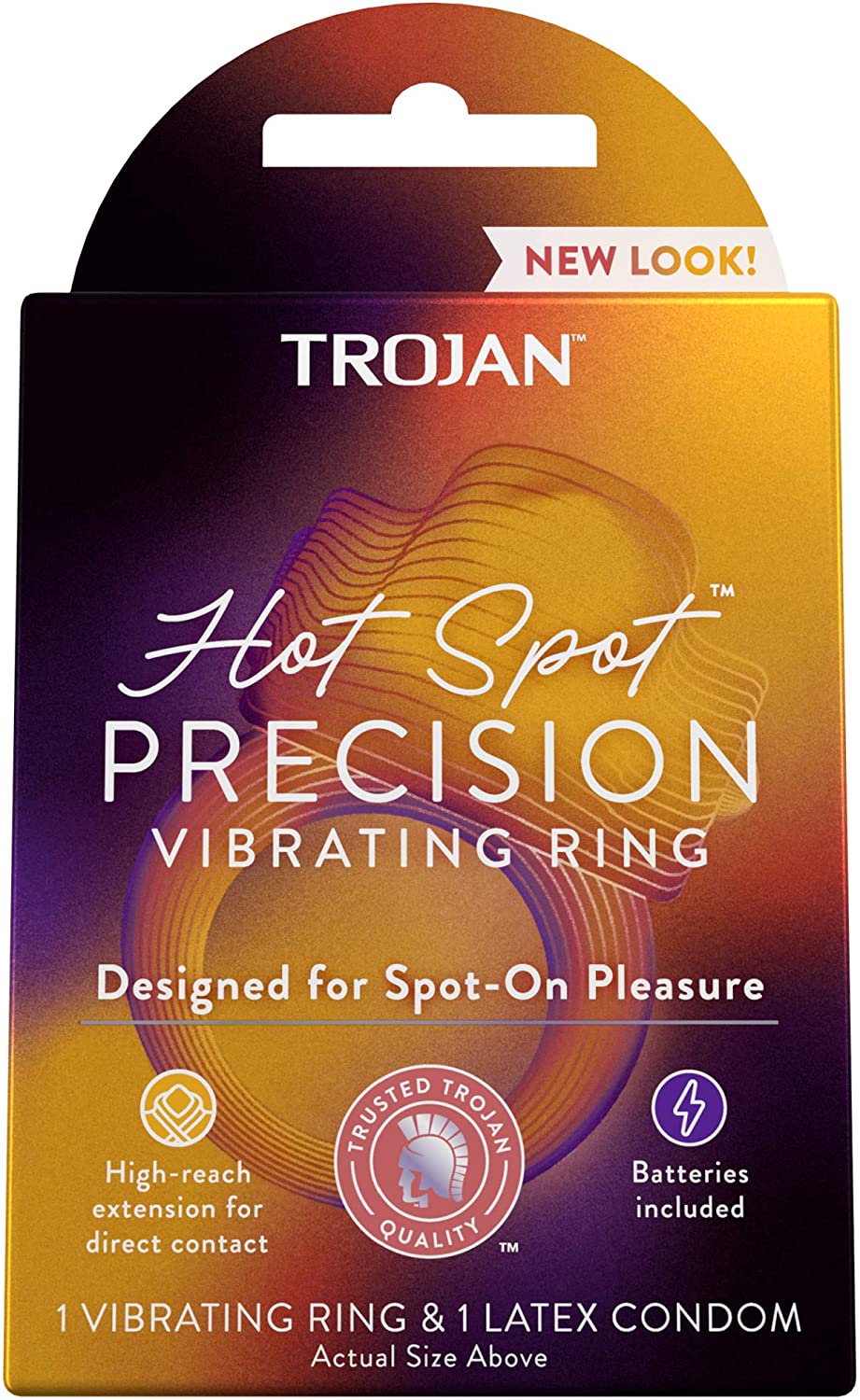 Take pleasure to new heights with TROJAN Vibrations Hot Spot Vibrating Ring. When he puts it on, this ring has a high reach extension for direct contact for her and more intense stimulation during intercourse for both partners. Designed to be used with or without a condom, it delivers spot-on pleasure every time. The vibrations last up to 20 minutes for one time use so you and your partner are guaranteed a night to remember. Includes one TROJAN Vibrations Hot Spot Vibrating Ring. More Americans trust TROJAN Brand than any other condom, for over 100 years, because we’re committed to investing in public health efforts to support sexual health. The TROJAN Brand promotes a safe, healthy, and fun sex life. From condoms to vibrators to lubricants, TROJAN Brand is dedicated to delivering innovative, high-quality products that offer pleasure and protection.