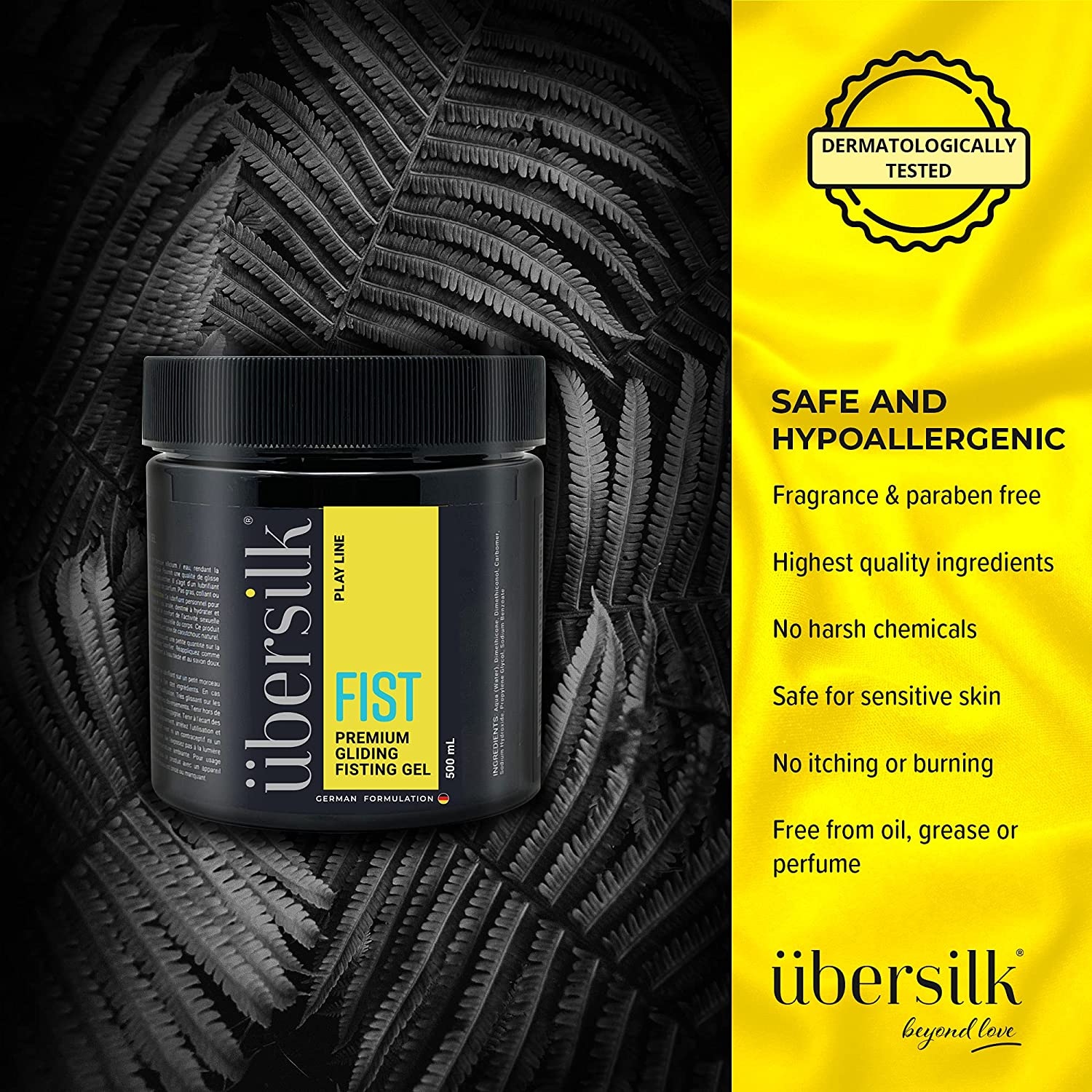 Übersilk Fisting Gel is a smooth, odorless hybrid lube that will reduce friction and enhance the comfort of intimate activity by providing a super-slick, never sticky, long-lasting experience. Besides, it's hypoallergenic, safe for sensitive skin, and is ideal for any kind of sexual intercourses, including anal or vaginal sex, fisting, intimate massages, solo play, and everything that gives you pleasure.
