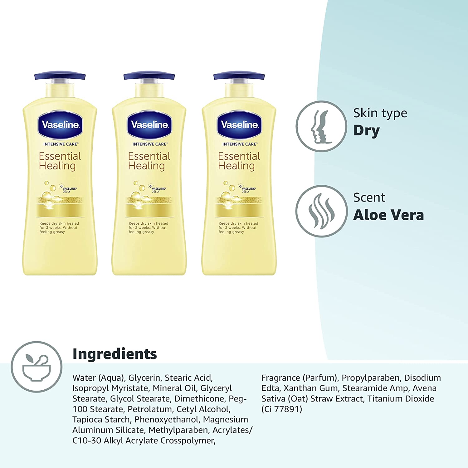 Vaseline Intensive Care Essential Healing Body Lotion provides fast-absorbing moisture to deeply moisturize dry, rough skin. Clinically proven to keep skin healed for 3 weeks (after using daily for 4 weeks), this non-greasy, fast-absorbing skin lotion is your go-to dry skin moisturizer. Vaseline’s moisturizing lotion goes beyond basic moisturization. Our Intensive Care range works to heal dry skin from deep within. Essential Healing contains glycerin, which draws and binds moisture to skin, and healing micro-droplets of Vaseline Jelly that lock in moisture, allowing the skin’s natural barrier to recover. The formula used in this body moisturizer for dry skin restores the essential moisture your skin needs, while also delivering a blend of nourishing ingredients. Vaseline Essential Healing lotion is the perfect daily body lotion and hand lotion for maintaining smooth, soft skin. The non-greasy formula relieves dry skin quickly by penetrating deep into skin’s layers, and it helps smooth rough skin, so skin feels soft and healthy. Infused with aloe vera, an ingredient that is known to help calm and soothe skin, smooth, hydrated skin can be yours with Vaseline Intensive Case Essential Healing lotion. Many of Vaseline’s dry skin lotions contain petrolatum to give your skin the extra care it needs. Explore our other Vaseline products and enjoy the healing power of Vaseline. We’re proud to be working with Direct Relief in our mission to promote better skin health for everyone around the world. The Healing Project provides dermatological care, Vaseline® Jelly and medical supplies needed to help heal the skin of people affected by poverty or emergencies around the world.