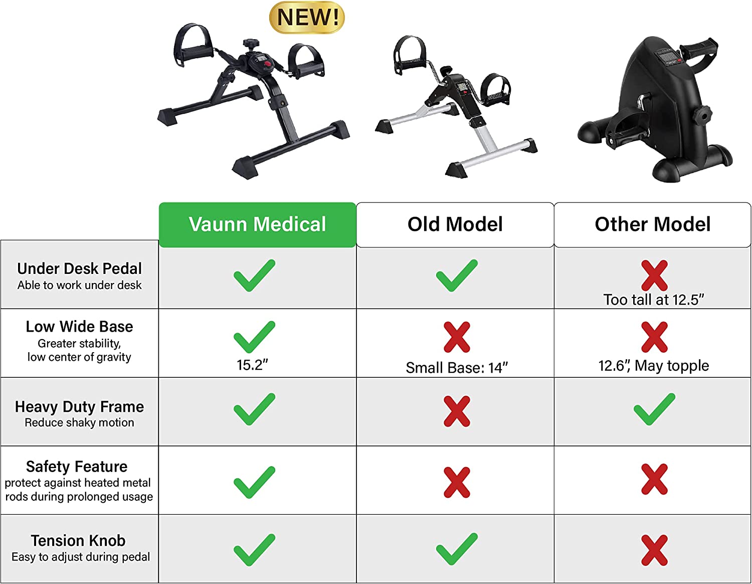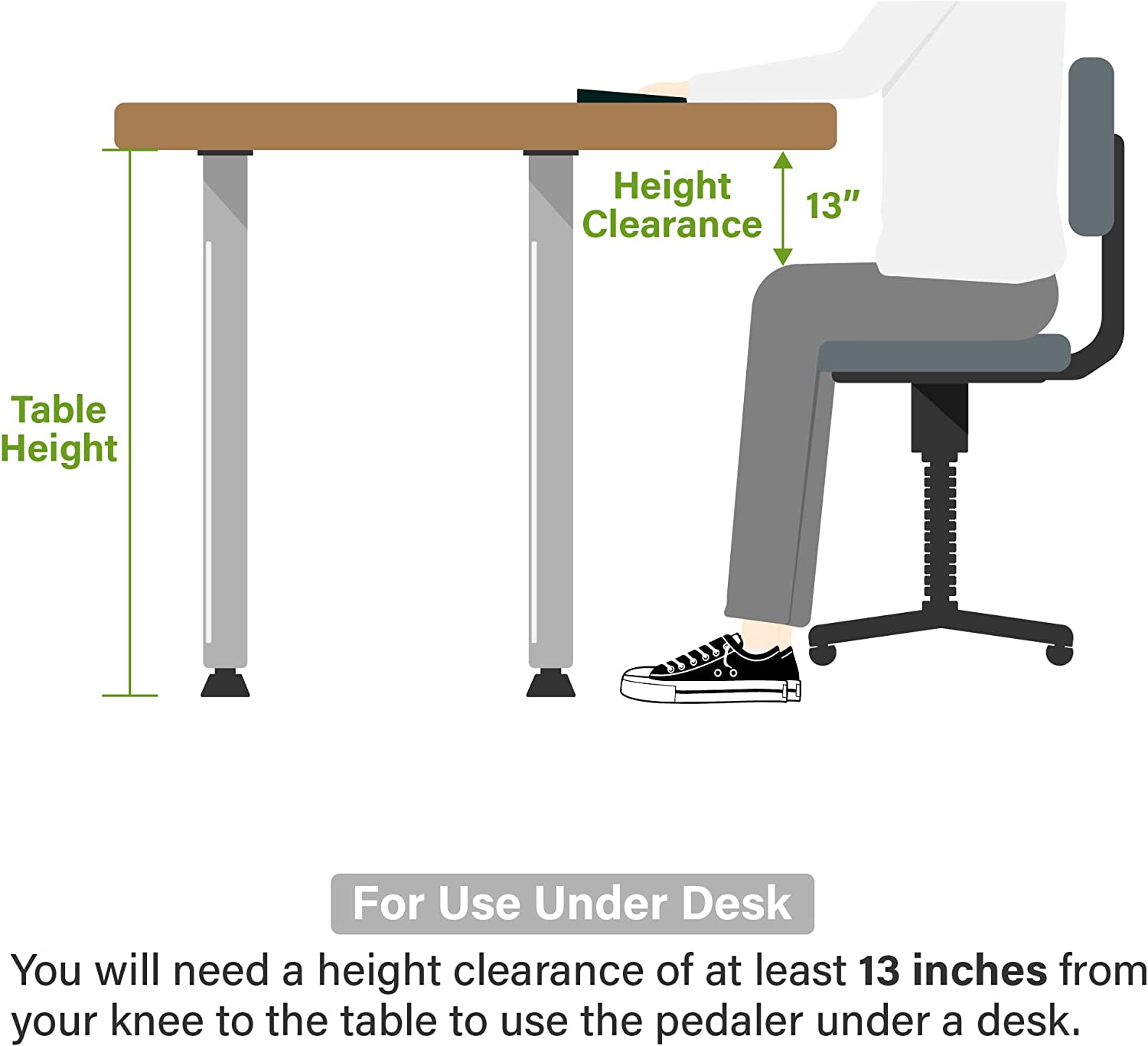 Enjoy your every workout. The Vaunn Medical Electronic Exercise Pedaler brings enjoyment to your daily workout. Just sit on your favorite chair, switch on your favorite TV program and start pedaling. If you hold a deskbound job, place your pedaler under your desk and start exercising. It is a great way to get your blood circulated and muscles toned, all while getting that deadline met. You may also use it as an arm exerciser to tone your arms. Equipped with a multi-functional digital LCD display, the device allows you to track and monitor your cycle counts and calories burned. In addition, its Quick-Release Folding Mechanism allows you to instantly fold your pedaler into a compact, portable unit so you can readily move it between rooms or bring it on the go. Exercise can now be accomplished anywhere together with your favorite activity i.e. reading a book, feeding your baby, chatting on the phone or watching a movie. Other features includes an adjustable tension knob which allows you to control the level of resistance and workout intensity desired. The non-skid ribbed rubber feet provide additional traction and stability during workout. IMPORTANT: This product is NOT designed for rigorous use. It is for gentle low impact exercise/physiotherapy. For use under desk, you will need a height clearance of at least 13 inches from your knee to the table to use the pedaler under a desk.