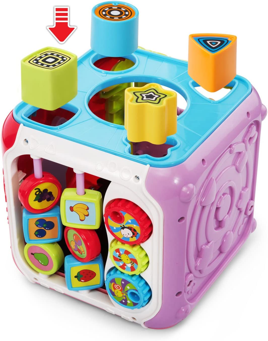The Sort and Discover Activity Cube by VTech is five sides of fun! Your little one will love exploring seven fun activities and two electronic panels that introduce colors, numbers, animals and more. Turn the book page, twist the spinner and slide the animals to develop fine motor skills. The activity cube also develops hand-eye coordination with the shape sorter and colorful shape blocks. Requires 2 AA batteries (batteries included for demo purposes only, new batteries recommended for regular use). Intended for ages 9 months to 3 years.