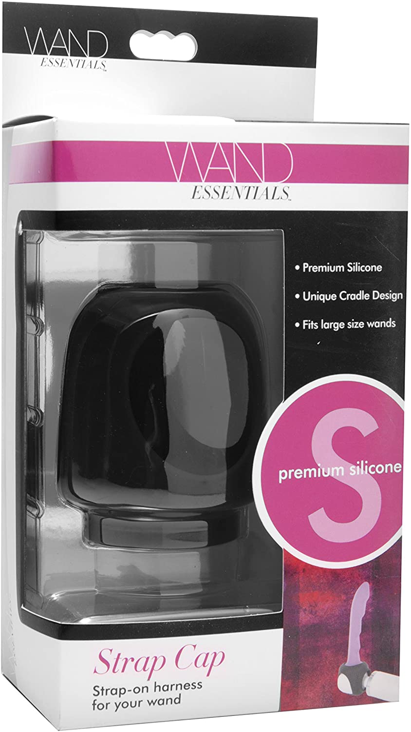 With the Wand Essentials Strap Cap, you can have the ultimate in penetrating pleasure with a strap on harness for your wand! Simply slip your chosen dildo through one of the top or side openings, then secure over your standard size wand. Once secured, position the dildo and turn on the vibration. The cradle is made of premium silicone, so it is hypoallergenic, highly durable, and semi stretchy. Take sensual pleasure to new levels with this unique attachment from Wand Essentials! Measurements: 3 holes total, measuring 1, 2, and 3 inches in diameter. 2.4 inches total diameter Material: Silicone Color: Black Note: Fits standard size wand massagers, including Hitachi. Wand and dildo sold separately