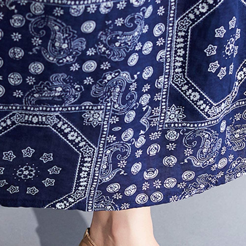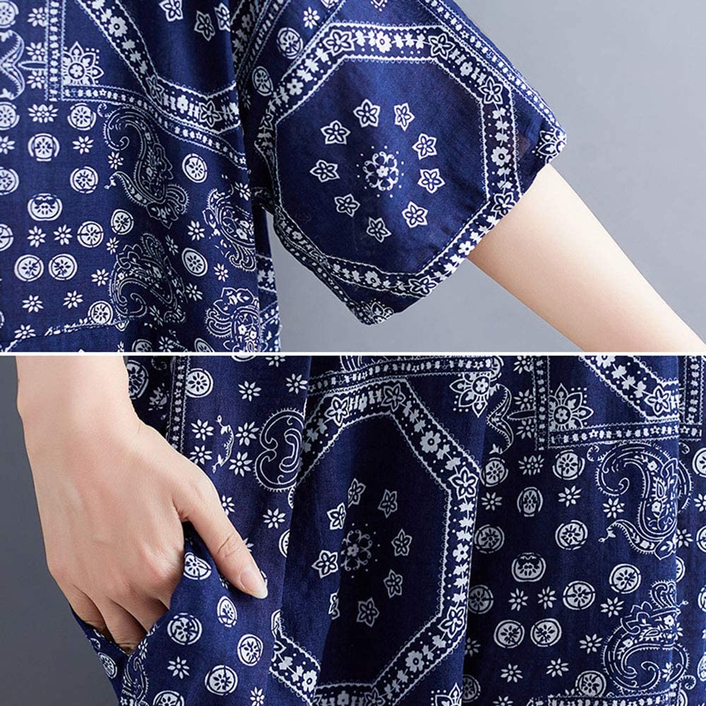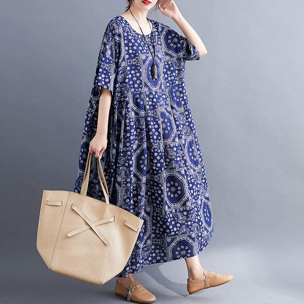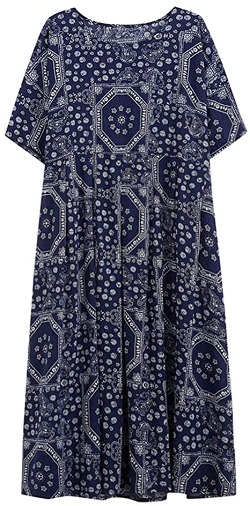 Women Loose Cotton Linen Dress Mixed Print Boho Maxi Swing House Dress with Pockets