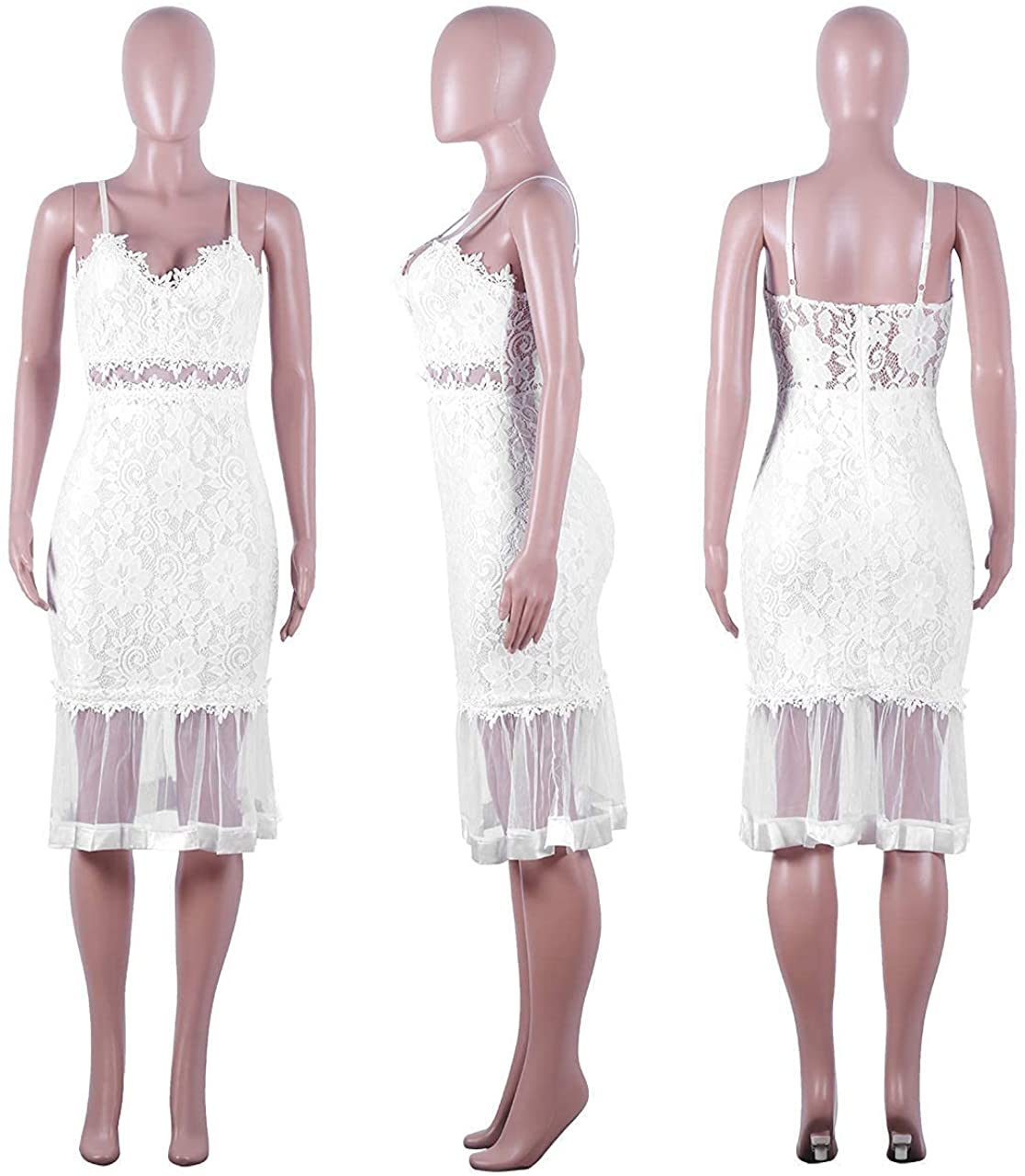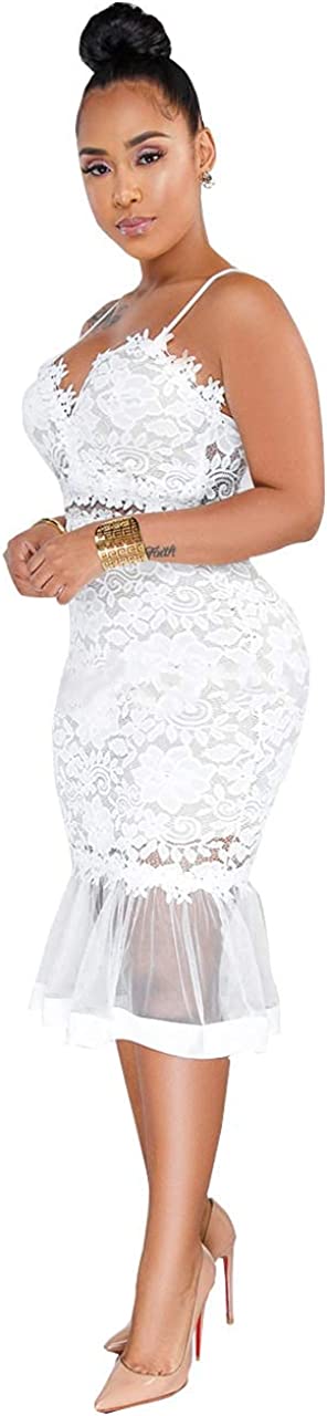 Women Sexy Floral Lace Mesh Sheer Hollow Out Deep V Neck Spaghetti Strap Bodycon Pencil Mermaid Midi Dress
