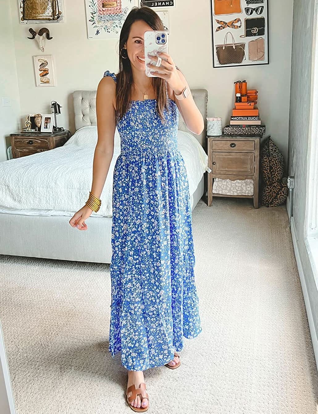 Women's Boho Dress Summer Spaghetti Strap Square Neck Flowy Ruffle Beach Long Maxi Dress