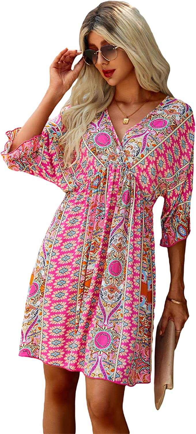 Women's Boho Tribal Print Short Sleeve V Neck Tie Back Summer Shift Dress