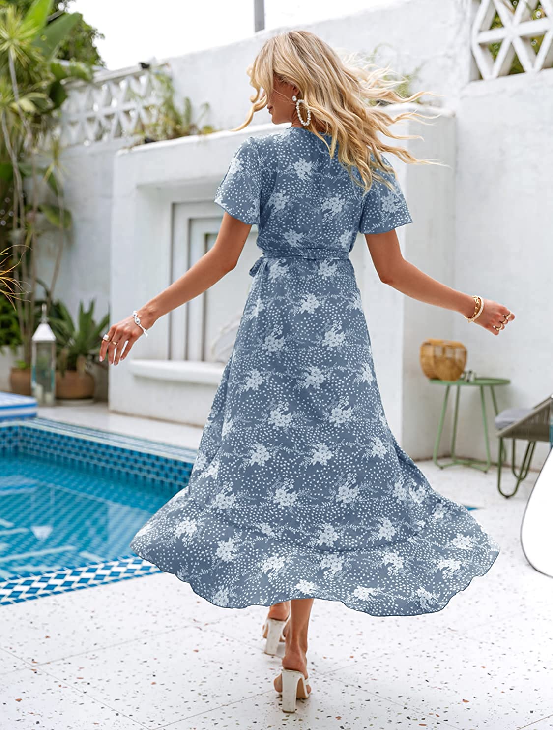 Women's Boho V Neck Ruffle Floral Wrap Maxi Dress